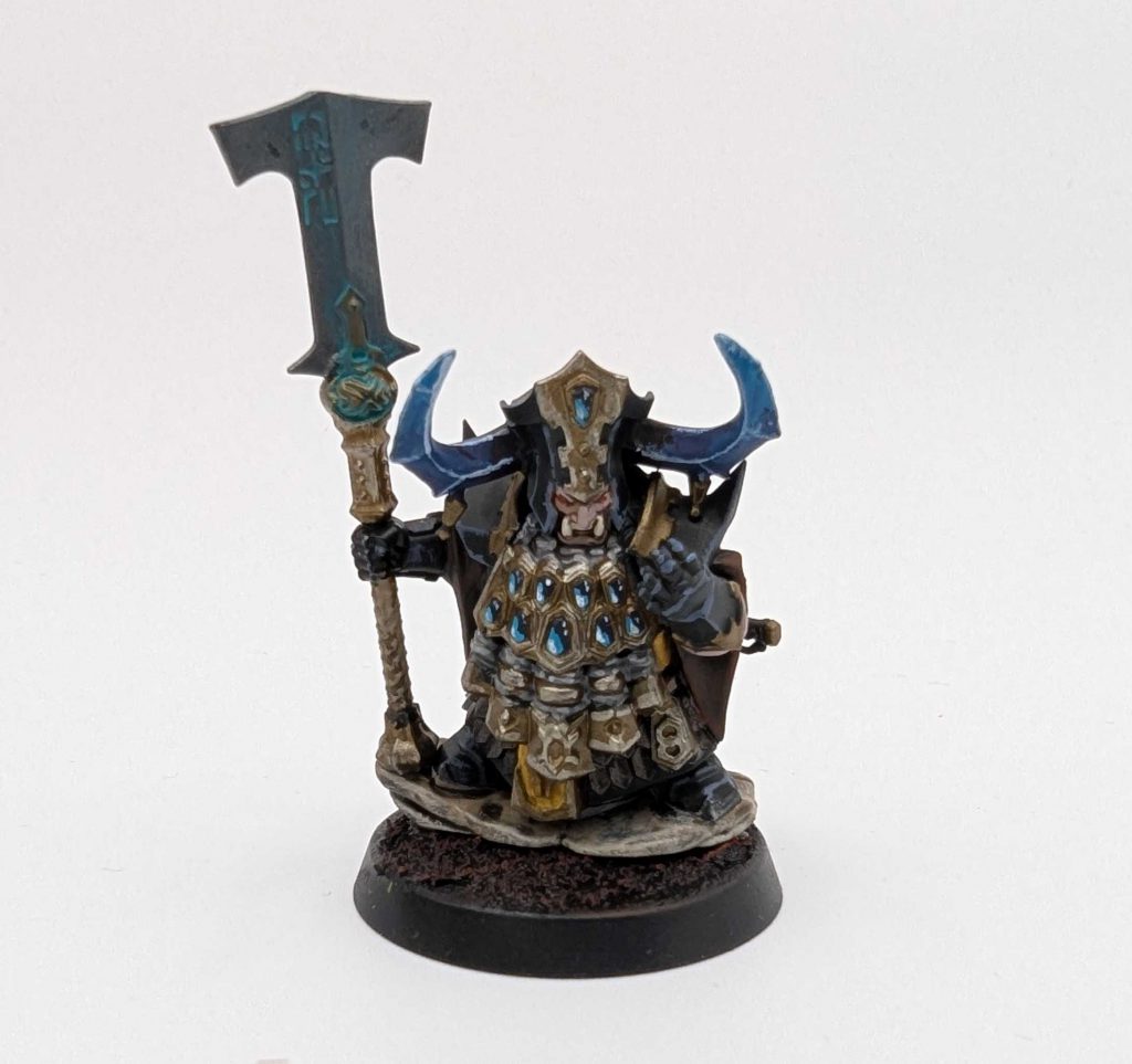 For the more religiously minded, the Ashen Elder is a Priest(1). He has the same statblock as the Daemonsmith but with no ranged profile. Ability wise, he gains a free Ritual Point if he’s near a piece of terrain or an objective with a Desolation Token on it at the end of your turn and has a 6” aura that expands by 6” for every token he has that allows Helsmith units to ignore the first point of damage each phase. He's your most expensive foot hero at 120 points, but is very worthwhile.