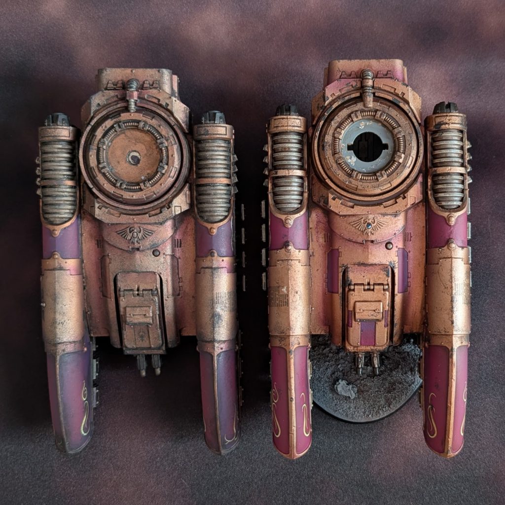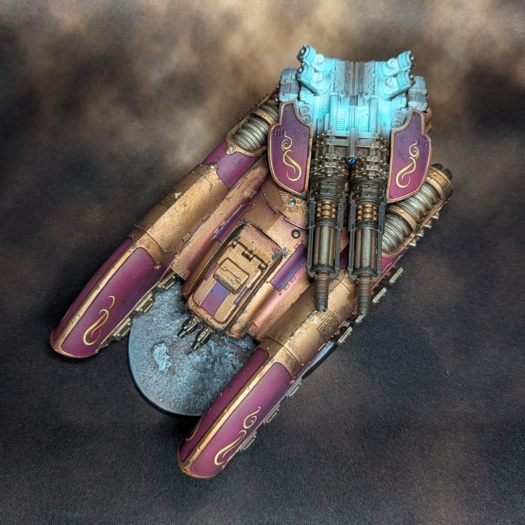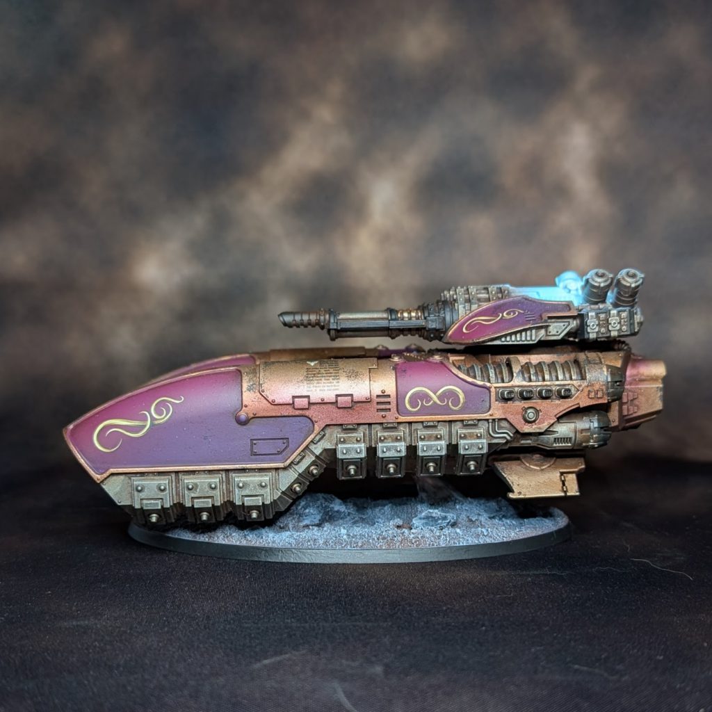 side view of Legio Custodes Grav-Tank (post-weathering) by Crab-stuffed MushroomsCrabstuffed Mushrooms (Joey K) I used my army scheme with this puppy: After priming black, I used Army Painter Warpaints Air Greedy Gold as the base color with GW’s Runelord Brass as a highlight, shaded with Eidolon Clear in the recesses (you can use diluted Magos Purple or Druchii Violet as an alternative). The base purple is Xereus Purple highlighted with Army Painter Warpaints Air Witchbane Plum.