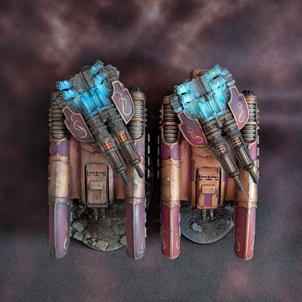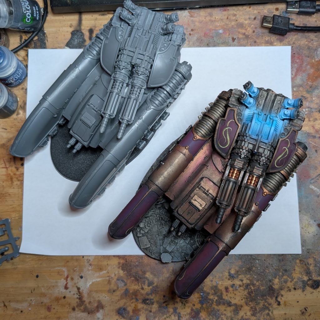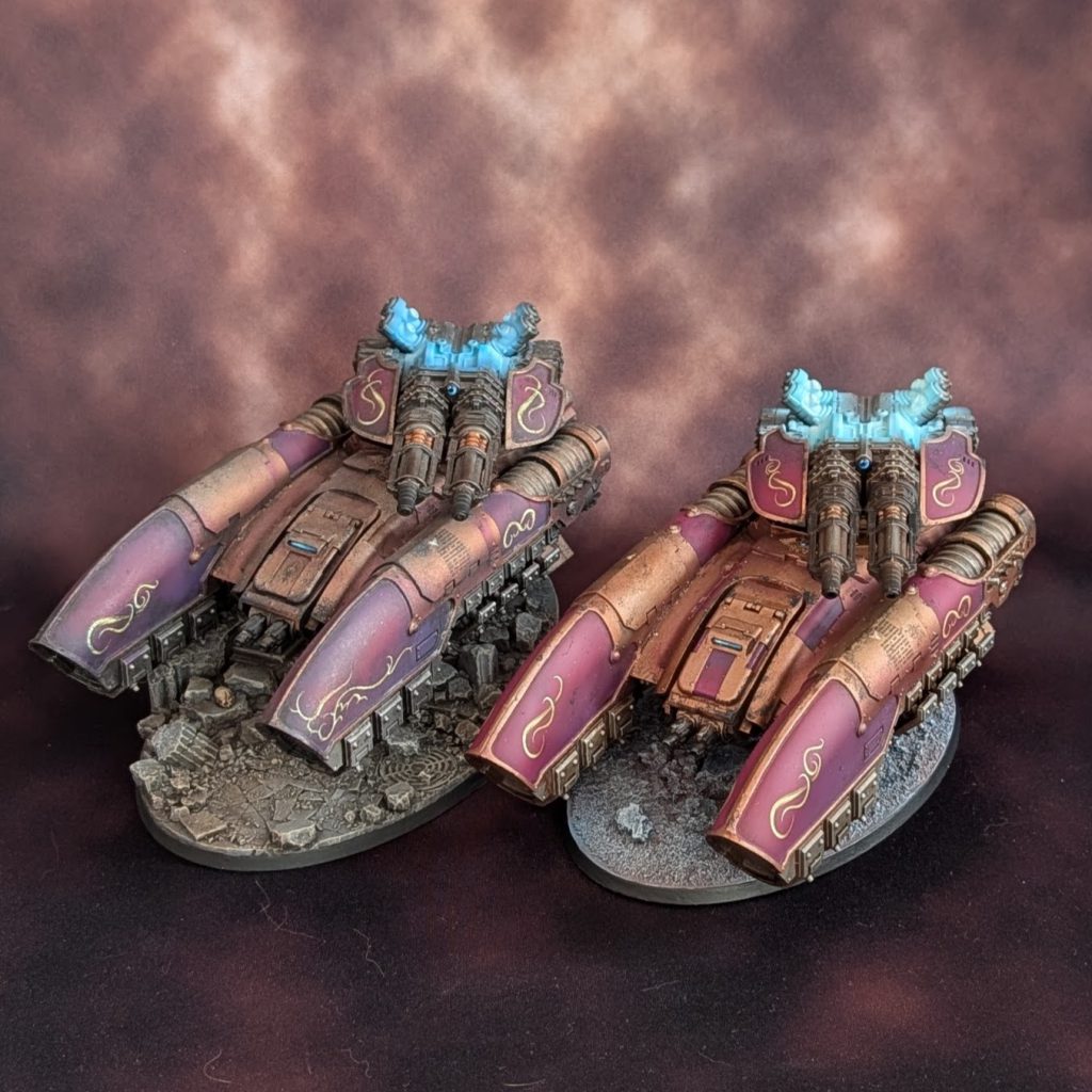 side view of Legio Custodes Grav-Tank (post-weathering) by Crab-stuffed MushroomsCrabstuffed Mushrooms (Joey K) I used my army scheme with this puppy: After priming black, I used Army Painter Warpaints Air Greedy Gold as the base color with GW’s Runelord Brass as a highlight, shaded with Eidolon Clear in the recesses (you can use diluted Magos Purple or Druchii Violet as an alternative). The base purple is Xereus Purple highlighted with Army Painter Warpaints Air Witchbane Plum.