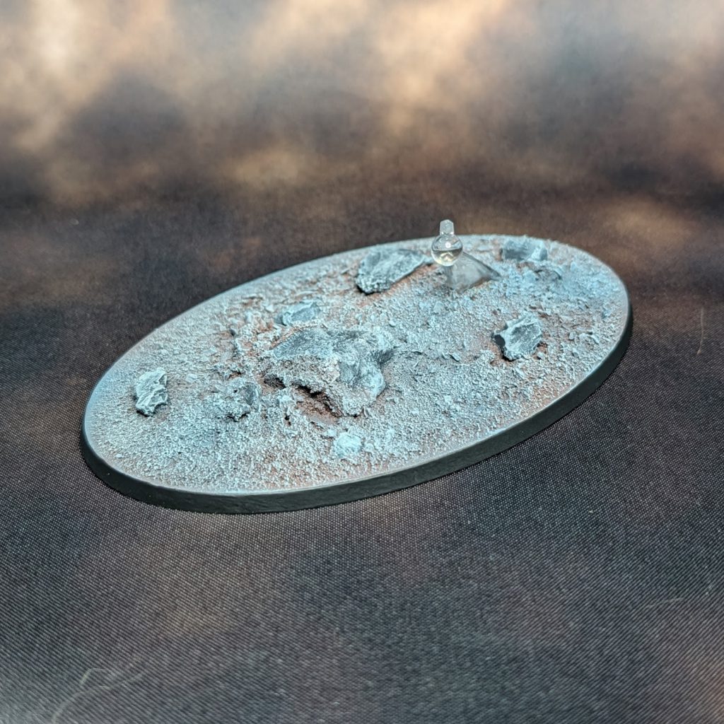 - I picked orange for the base color to complement the dark blue of the armor. The ground was painted Doombull Brown, highlighted by Skrag Brown followed by a lighter highlight of Balor Brown. The base rim was painted Corvus Black.