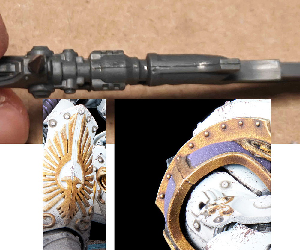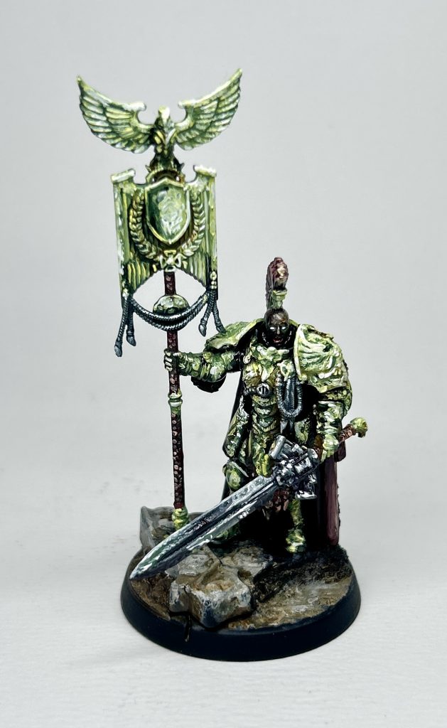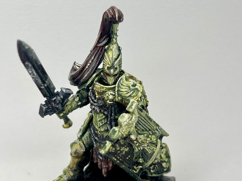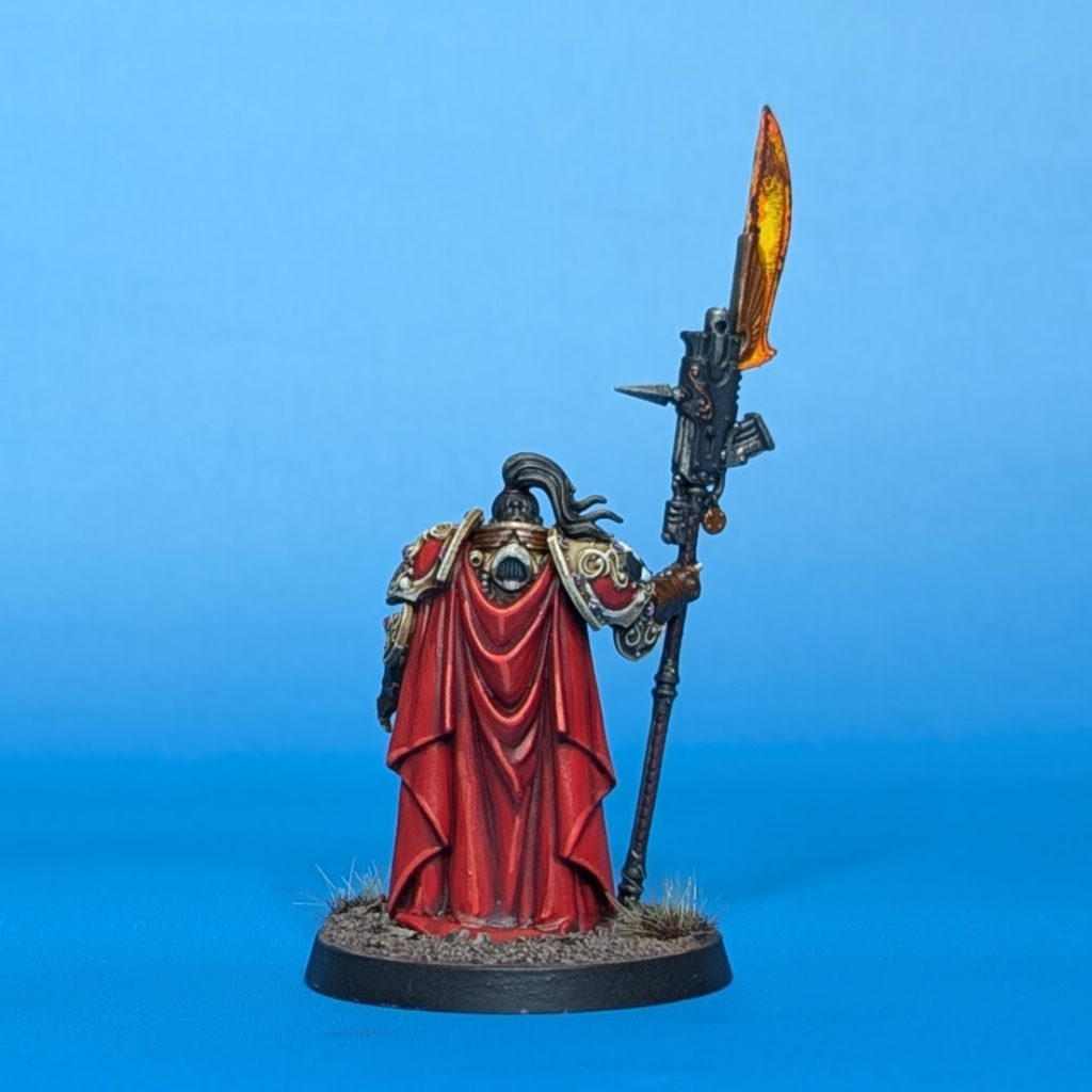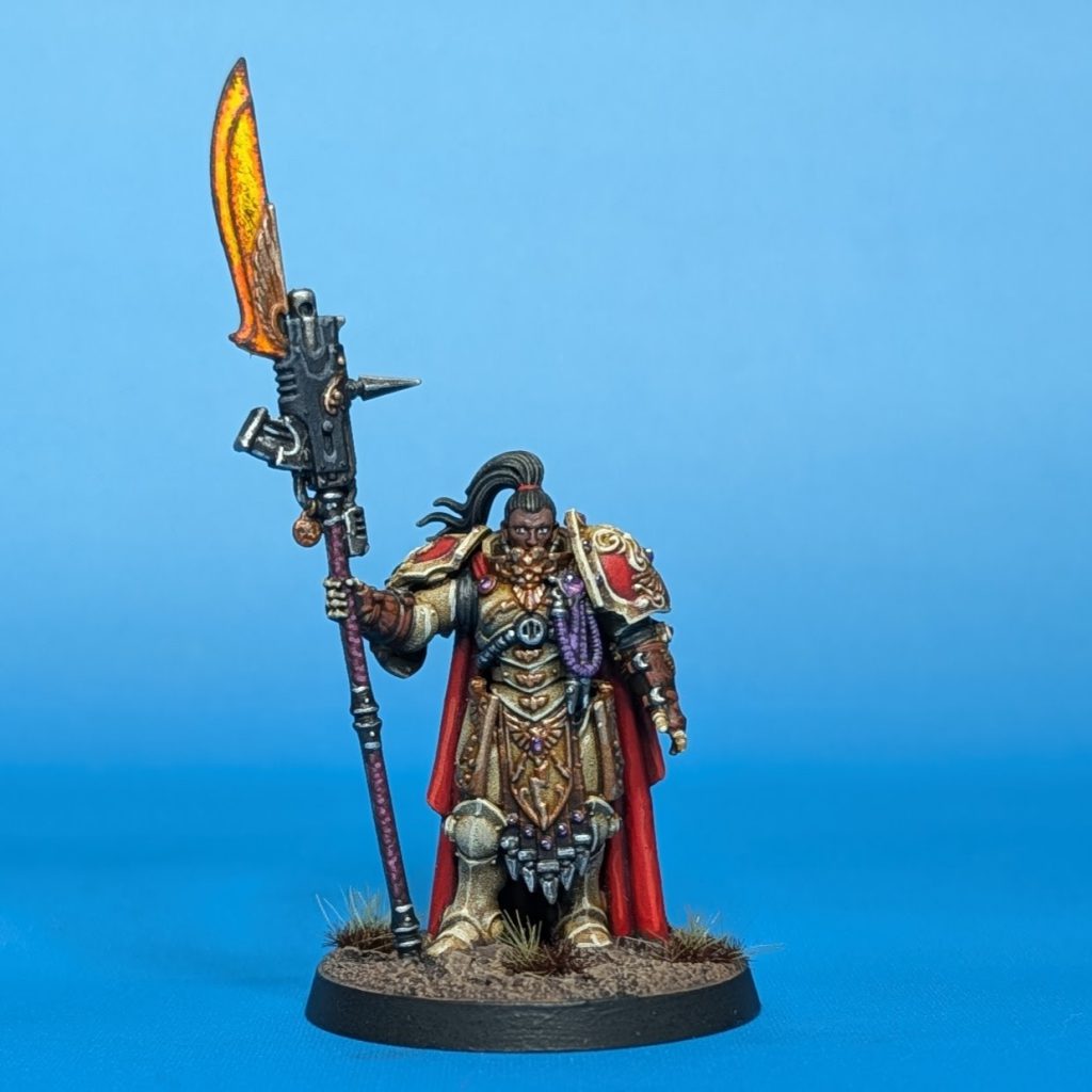 Legio Custodes Shield Captain. Credit: NotThatHenryCThe Captain’s Eternity Blade has the “Aflame” rule, which I’ve represented by painting it like it’s really hot. I painted it Wraithbone and then blended a transition from Bad Moon Yellow to Magmadroth Flame. The recesses got a wash of Dorn Yellow thinned with contrast medium and I then painted the edges and some chips in black.