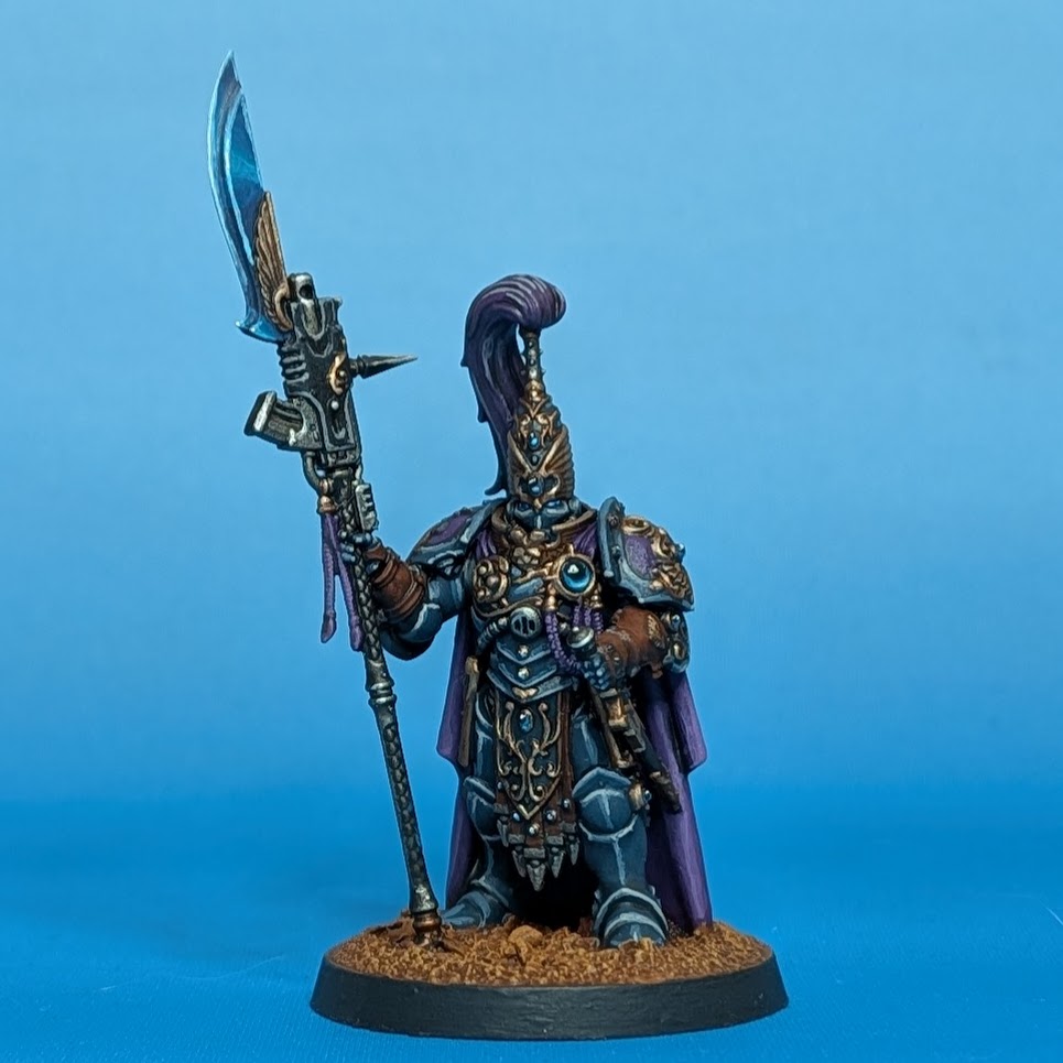 Blake Law: This was the model that got me wanting to play 40k again. Absolutely stunning sculpt, and it was a joy to paint. Really no bad notes here, it holds detail amazing and your options for approach are endless.I did the same gold progression as I did for the shield captain (see above). The teal is also the same. I airbrushed it on and painted in the gold for this guy. This is mainly because teal is just harder to get right by brush. The little gems are monument pyrole red worked up with AP fanatic ice yellow, and worked down with coal black. Goonhammer has an exceptional guide for painting gems, which I actually used for this piece!