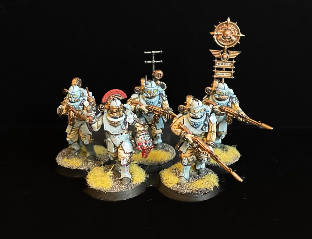Solar Auxilia Rifle Section, credit: LenoonListbuilding is unique and feels very appropriate. In the prior iteration of the army, Tercios were organizational units represented by a single FOC slot - each slot could consist of all the units for that Tercio type. This is now represented by the various Tercio auxiliary detachments - each detachment chart, when unlocked, allows the player to take all the constituent units of that Tercio type. These detachments are in turn unlocked by taking the Command Section corresponding to them - at launch, you can take Line, Veletaris, Hermes, Artillery, and Armoured Command Sections, each of which unlocks a detachment of the corresponding type.