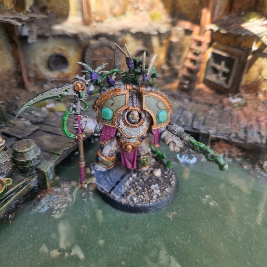 Death Guard Saturnine Praetor - JellyMuppetWhile painting it, I was unsure how to handle the shoulder nodules. I wasn’t sure if they were meant to be glowing shield projectors, metallic components or armour coloured panels. In the end, I went with glowing shield projectors! Between the smoke, junk, pipes and shield generators this model has a lot of glowing green on him, which makes sense as an eye-catching praetor.