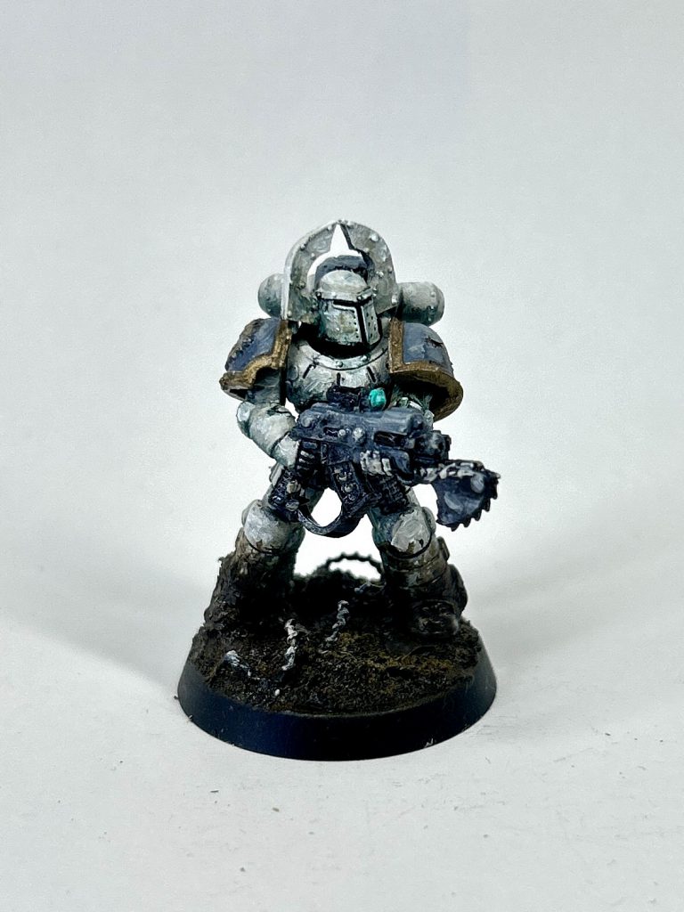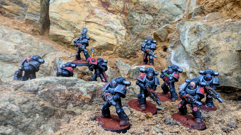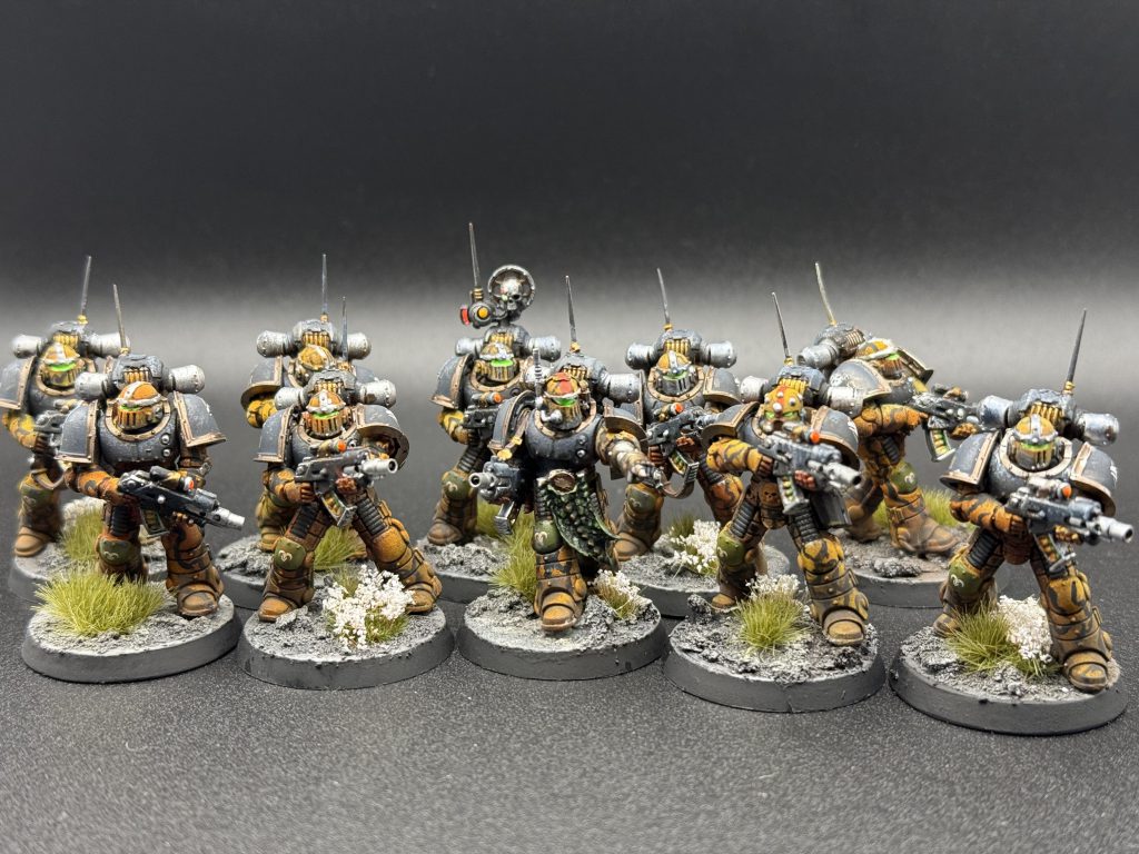 MKII Raven Guard Veteran Squad. Credit: NotThatHenryCI play Raven Guard and the rest of my army is in MKVI, so initially I wasn’t sure how to make these guys fit. Instead I decided to make them stand out on purpose, to mark them out as veterans. I went with an interpretation of a unification-era XIX Legion scheme I’d seen. I painted them grey instead of black using a sponge to build up highlights from Mechanicum standard grey through Dawnstone to Administratum grey. I like how this gives the armour a slightly textured look, a bit like you sometimes see on cast armour. It’s quite different to the smooth matt finish my other Raven Guard have.