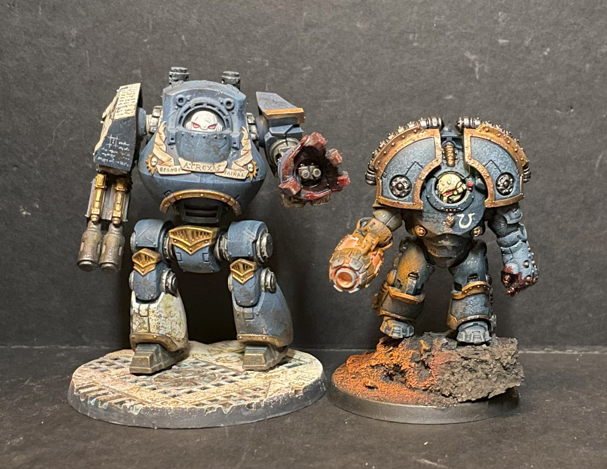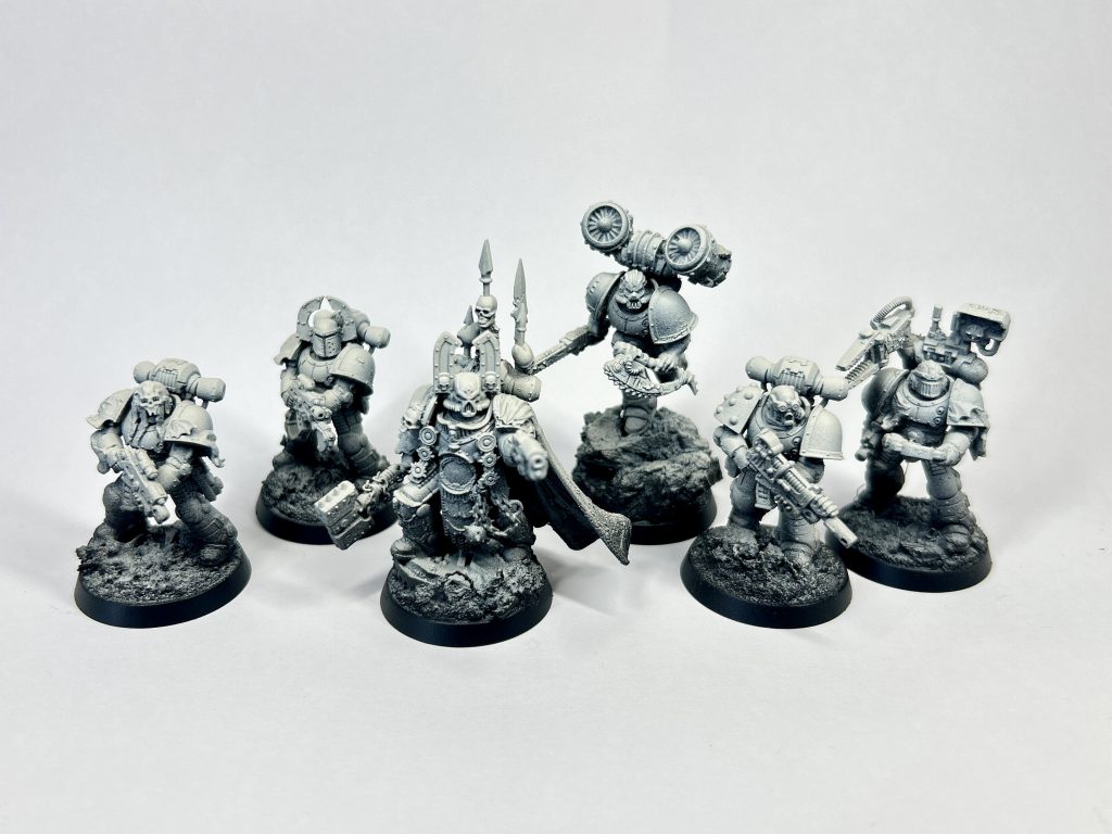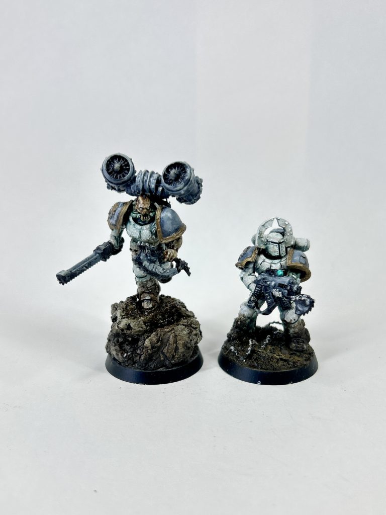 Saturnine Terminators. Credit - LenoonThere’s a lot of parts here, and the build is more similar to the Leviathan or the Contemptor than to other infantry. You’re making a large hollow box, as you would a vehicle, and building onto that. They are definitely min-dreadnoughts in size too, not far off the height of the old metal boxnaught, towering over even the characters in the Heresy 2.0 launch box. I’ve based mine on giant hero rocks to accentuate this because I think it’s funny, but they are *huge* even without the rock!