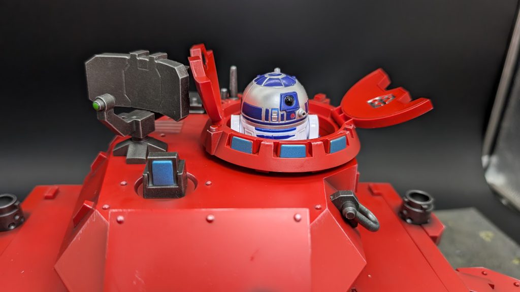 Where I think the model has some issues is baked in with the Predator in general: There's a central shaft that mounts the turret, and there's room and an attachable platform for a Marine to stand on and presumably command the Tank. However, the central shaft of the Predator does not line up with the top hatch on the turret. Though thinking about it now, this may just be the gunner's platform. The commander's hatch can also fit a Firstborn or a tacticus Intercessor, but you would need to bend the figure's knees to have it fit. The only action figures that really fit were a BST Teenage Mutant Ninja Turtles Donatello and a Black Series R2-D2.