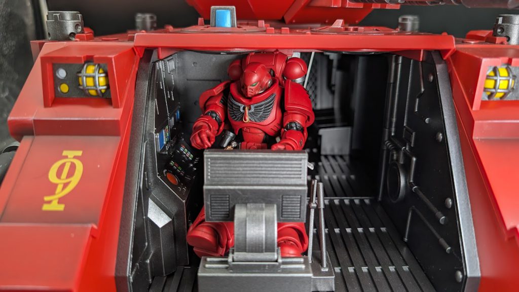 This is where I think this model begins to have it's biggest problem: While it does not necessarily need any figures to go inside it in the crew compartment, I do not understand why you would purchase an action figure vehicle and not have as many crew members for it as you could fit. Furthermore, there aren't a whole lot of Blood Angels figures that really fit in here: while the Mark VI Blood Angel and the Intercessor Blood Angel are available (and indeed, I put the intercessor in mine!), there aren't a bunch of figures modeled on the old Blood Angels Tactical Squad currently on sale. They were released several years ago, and now command a high price on the secondary market.Final Verdict