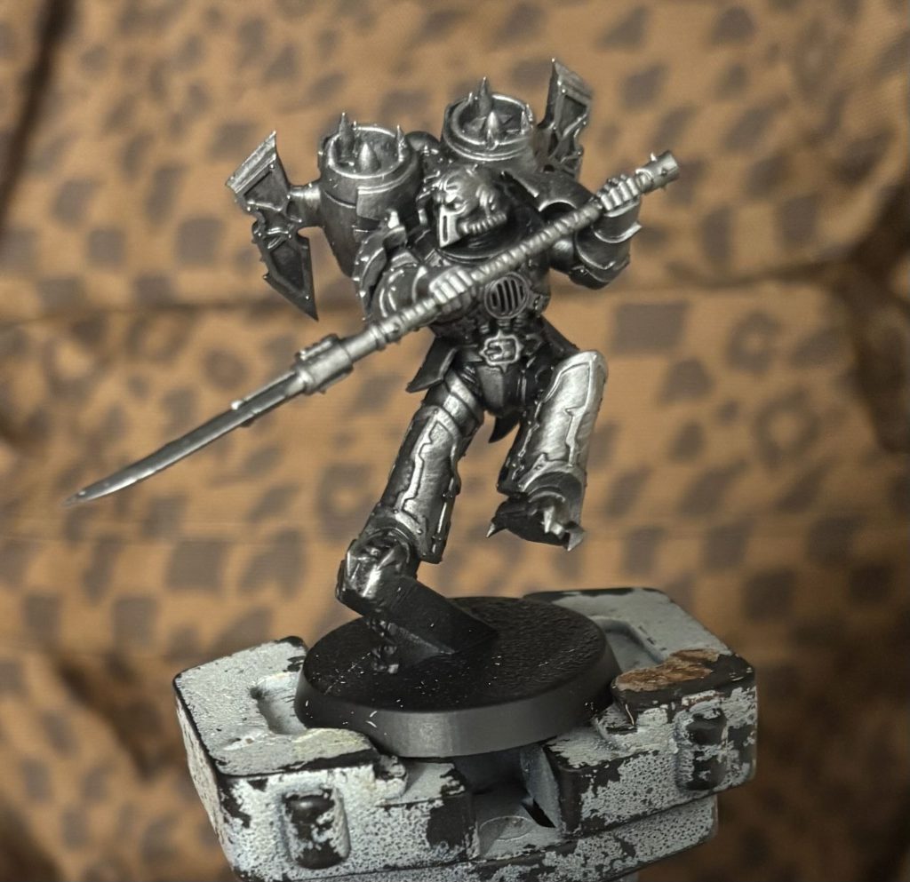 I began with a black undercoat and worked my way through Vallejo Dark Steel, Steel and Silver with a drybrush while next up I finally got experienced the CSM joy of trim. For this I began with Scale 75 Decayed Metal and then up through Citadel Brass Scorpion, Castellax Bronze and Canoptek Alloy.