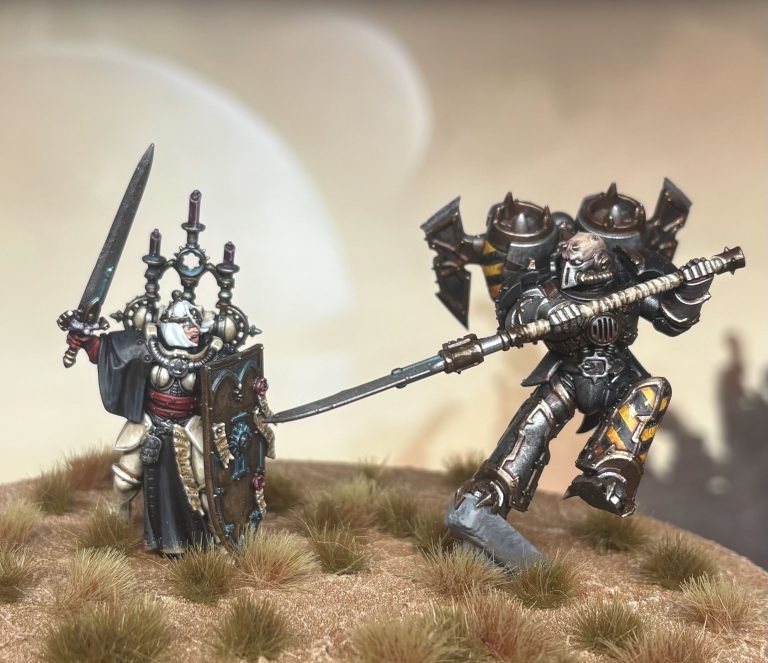 Having built the Huntmaster I knew the Abjuror would be perfect with her shield and with a little clipping I used a power sword from a different model in the set so that it was raised to strike back at the Iron Warrior while I also chose a bare head.
