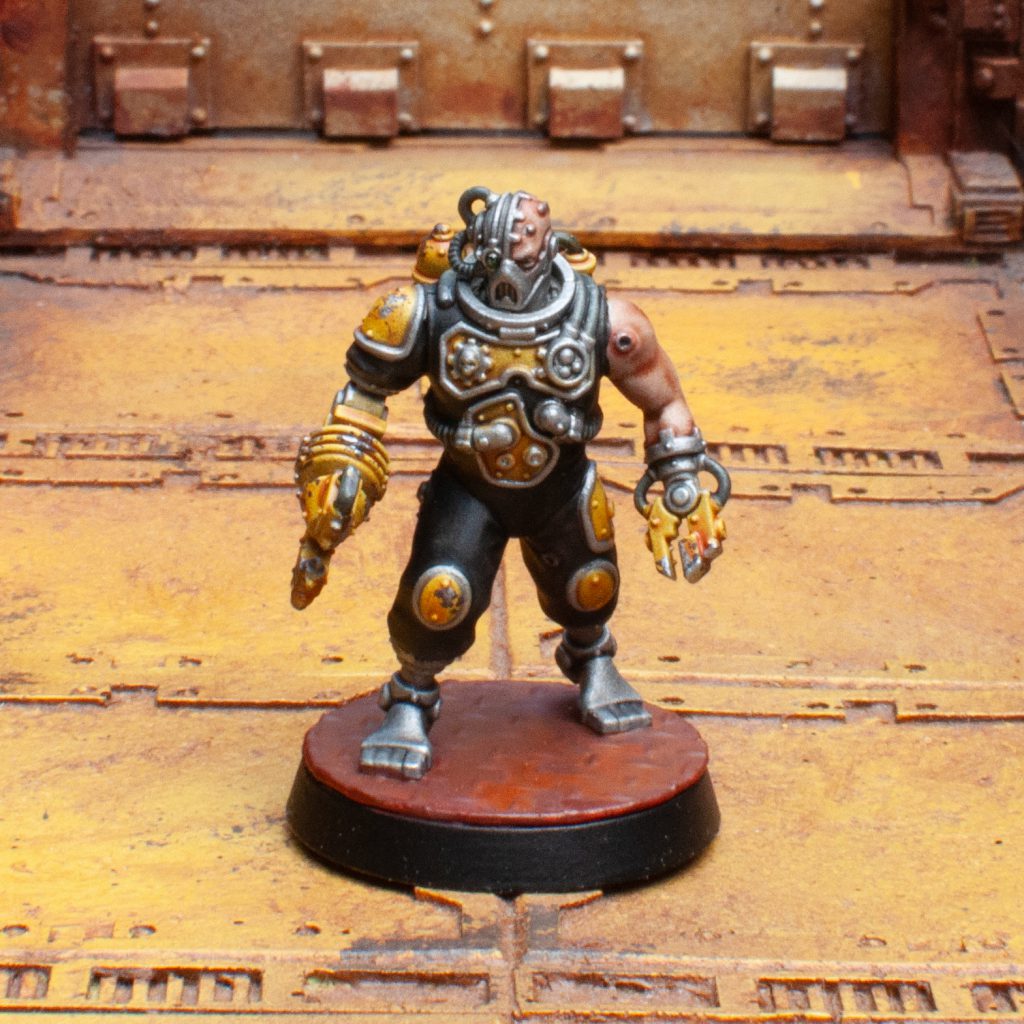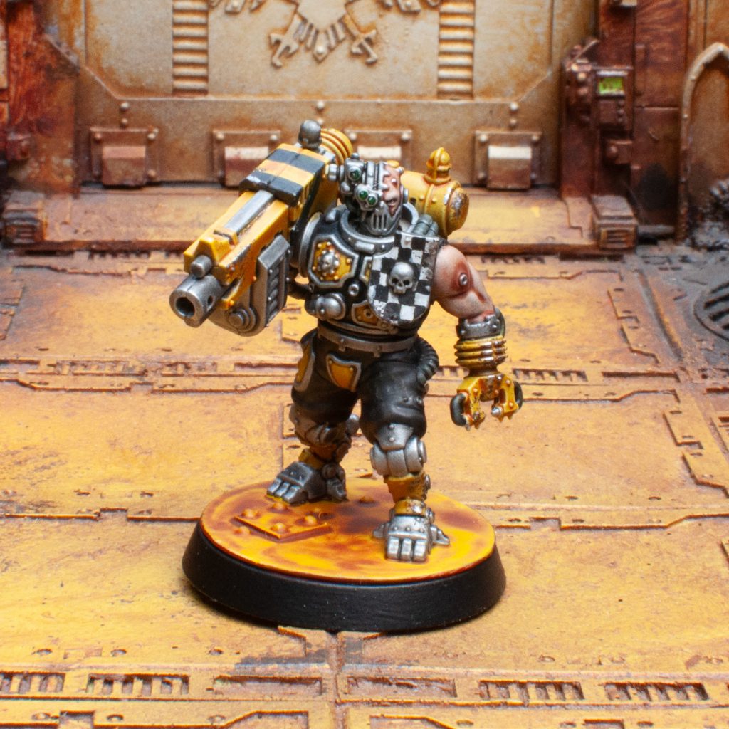 Battleclade Servitor. Credit: 40khamslam.DYLON: I too love Contrast, and believe it or not, the Battleclade work pretty well with it. I used my usual Zenithal base coat. Undercoats are in Black Legion, Armor panels in Iyanden Yellow, and the skin with Gulliman Flesh. I mixed up a glaze of Blood Angels Contrast and Skeleton Horde to glaze around the plugs and areas that join with the augmentations, to make it look irritated.