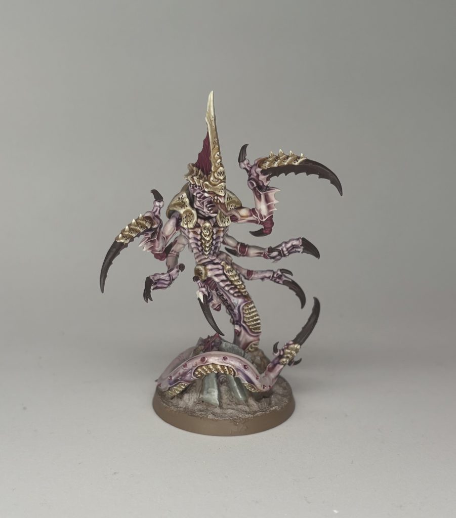 Sky Serpent: Tyranids adore Contrast. I’d painted several models from Leviathan with a quick Contrast based scheme and used those as inspiration but like any good hive mind based organism I went with the flow and let the scheme evolve on its own.I began with an undercoat of Wraithbone and then did an all over wash with Carrioburg Crimson thinned down with Contrast Medium and then used Druchii Violet in the recesses and towards the end of the appendages. To finish the skin I added a highlight of Pallid Wych Flesh.