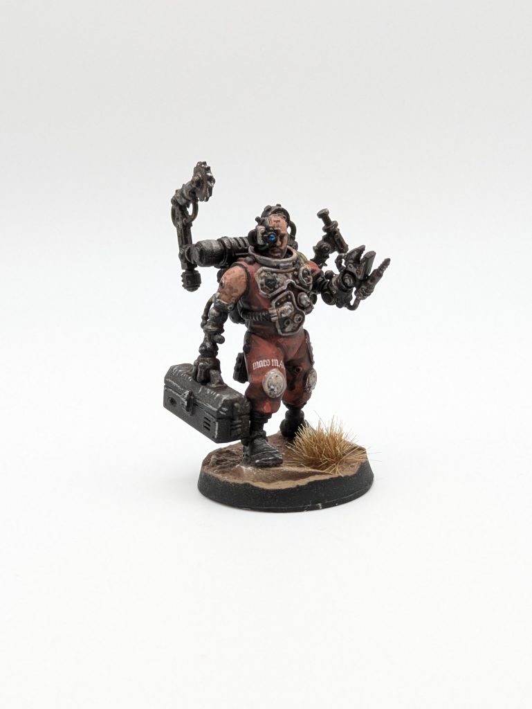 Battleclade Servitor. Credit: 40khamslam.Battleclade Servitor. Credit: 40khamslam.Otherwise, tubes were painted with Black Templar, metals painted up with Runefang Steel and washed with Nuln Oil, and then any yellow metal song chipped with Dryad Bark and stippled with Runefang Steel. Lenses got a quick coat of black, line of white and glaze of Warp Lightning finished with a white dot and coat of 'Ard Coat. Red armor panels were done in Blood Angels Red Contrast.
