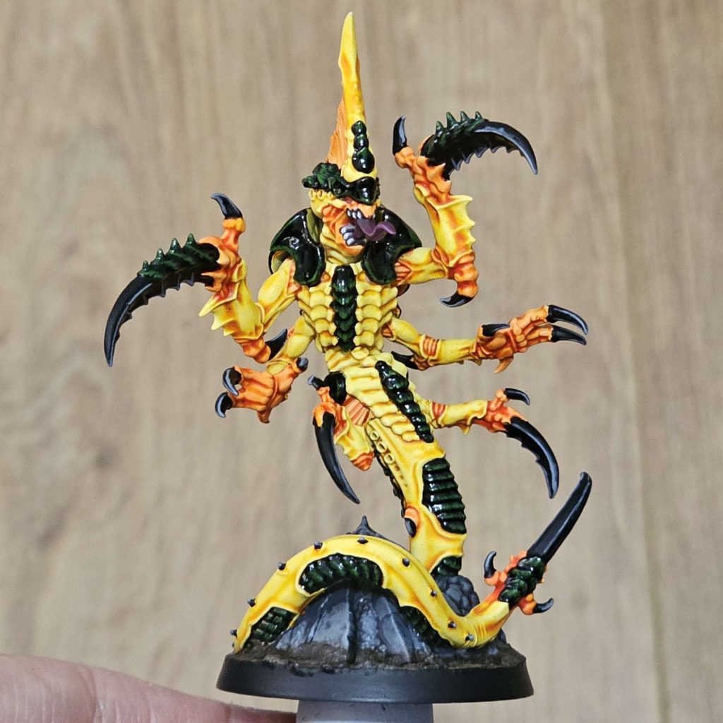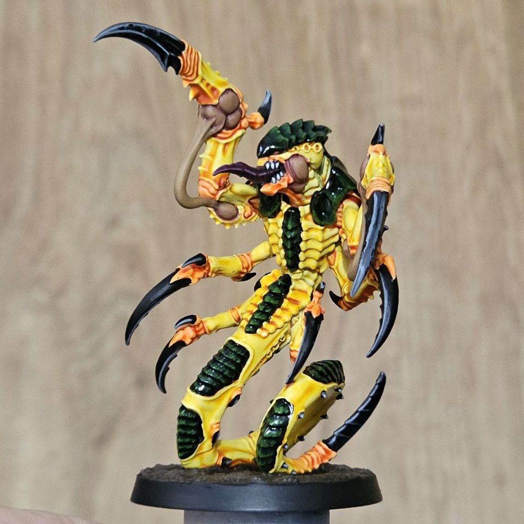 After adding the eyes and tongue, I added some yellow areas to the Tremorscythe, Felltalon and Venomspitter, beginning with Averland Sunset and adding increased amounts of Dorn Yellow.