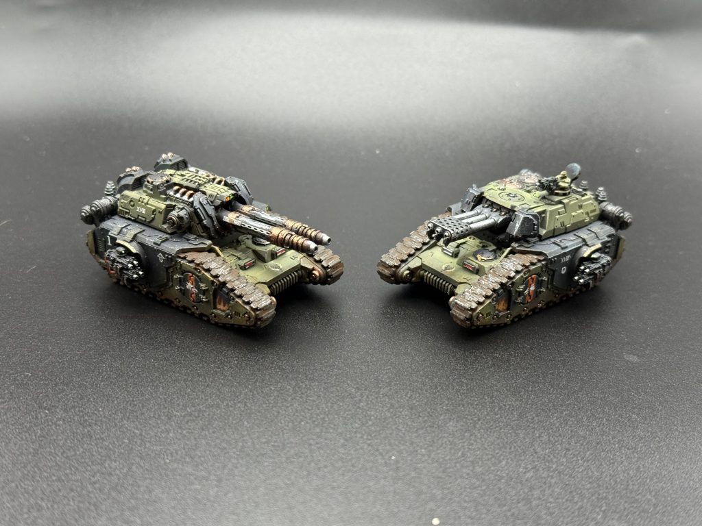For painting I left the turrets off for ease of access to the main body of the tanks and painted them just the same as above. I wanted the turrets to be black and really stand out amongst the crowd of green armor on the table so leaving them separate made this a lot easier. I did a little more work on these compared to the other kits, coming back in with Runelord Brass on the banding of the Laser Destroyers and the Glaive to make them pop just a little bit. I also added some freehand mimicking the Cthonian gang markings found on the Heresy Sons of Horus transfer sheet from Forgeworld.