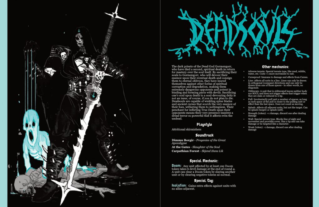 Deadsouls is rarely able to last long in a stand up fight. Despite having a high defense value, the value needed to roll a hit in Maleghast, their roster has generally lower HP and even when you miss in Maleghast you can still take damage from a graze. So, the Deadsouls playstyle is built around rarely actually engaging your opponent, but instead by placing walls on the battlefield and spreading weak tokens to reduce your opponents ability to see or hurt you. When you do engage, you often get bonuses by using the unique isolation special tag, which goes off when a unit has no adjacent allies.Lastly, the big Deadsouls special mechanic is the doom mechanic. If a unit is affected by doom, they receive a doom token. If that unit does not clear the doom token by either cleaning negative tokens or slaying a unit by the end of round four, it takes a huge chunk of devil damage that can’t be ignored and will kill anything short of a Necromancer at full HP. And the Necromancer won’t be having a fun time if they survive.
