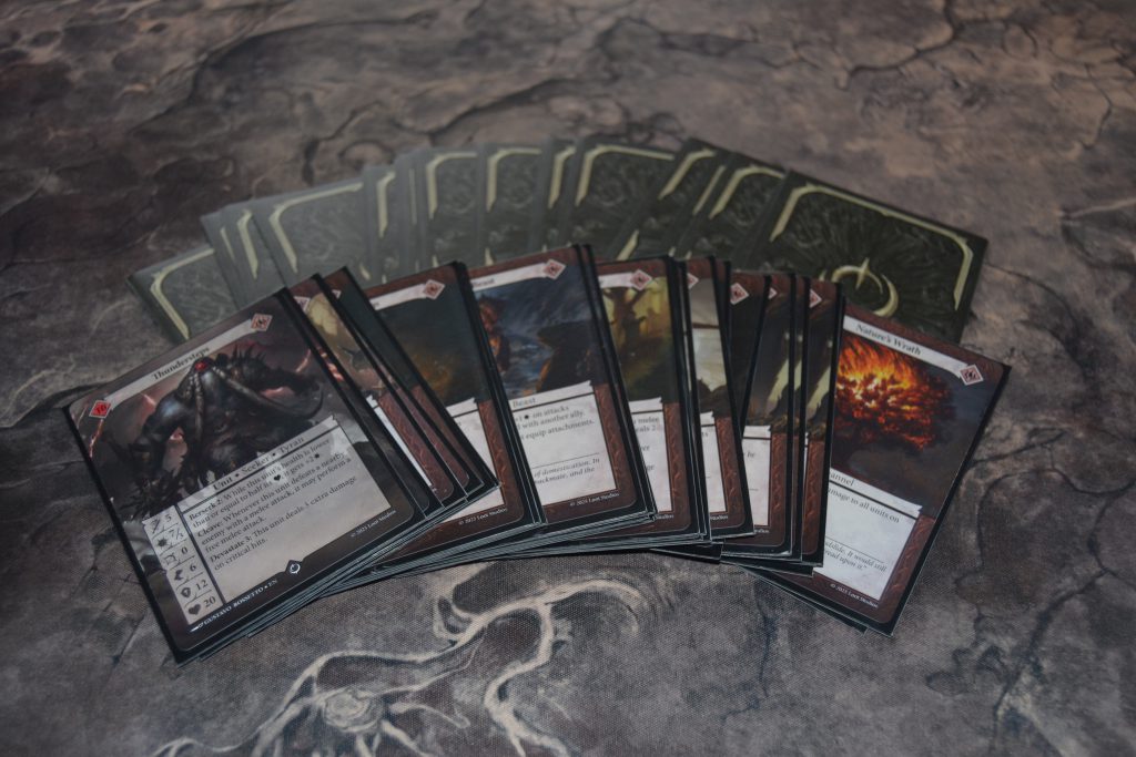 In some tabletop games you need to create an army list, or a warband. In Malediction you create a deck of cards that contain spells, units, and attachments to improve said units. Deck building will be crucial for achieving your desired playstyle within the game of Malediction.The design of Unit cards is what makes Malediction so unique. Each card is broken down into statistics that make up who they are. Following this they will have some abilities that enhance these stats. The stats are: Accuracy for how capable you are at hitting your target, Power for how much damage you can do, Range for how far you can attack, Speed for how far you can move, Defense for how hard it is to hit you, and finally Max Health for how much damage it would take to defeat your Unit.