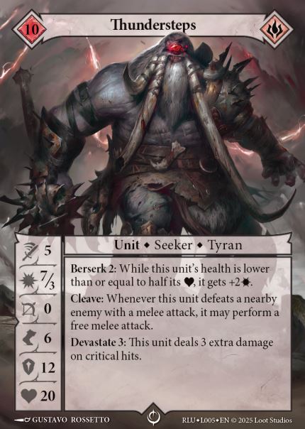 One aspect I appreciate is that the cards feel like how the lore is written. It may seem like an obvious take but it is remarkable how often rules are written that don’t reflect the model on the table. As an example, Thundersteps, the Seeker for Primal Blood, is like the Godzilla of Malediction. He isn’t a leader, more of a force of nature that devastated everything in his wake, and the rest of the faction follows the trail of destruction taking advantage of what is left behind by this giant. He is big, tough, and hits hard, which represents his tremendous power and terrifying legend. If Thundersteps couldn’t take a hit from a foot soldier, or couldn’t squish a flesh construct, then it wouldn’t be right. Each card has been crafted to have a good feel of play.