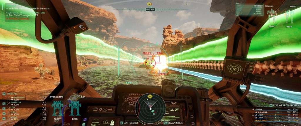 Weapons mostly felt good with one caveat - everything that uses ammo needs more of it than you think. This game has very long missions where you'll be fighting against dozens of opponents, and while most missions have at least one ammo crate to refill all your ammo you will still end up running out. Hotfix #2 is likely out by the time this publishes and will fix the worst offender by bumping SRMs from 90 missiles per ammo bin to 150, though LRMs and ultra autocannons are still at risk of running low. At some point in my playthrough I used pretty much every weapon and felt like they all have a place where you can pick whichever one you have a preference for and be successful with it, with the exception of machine guns that feel useless. There aren't any infantry to kill, so there's not much point in that weapon existing.