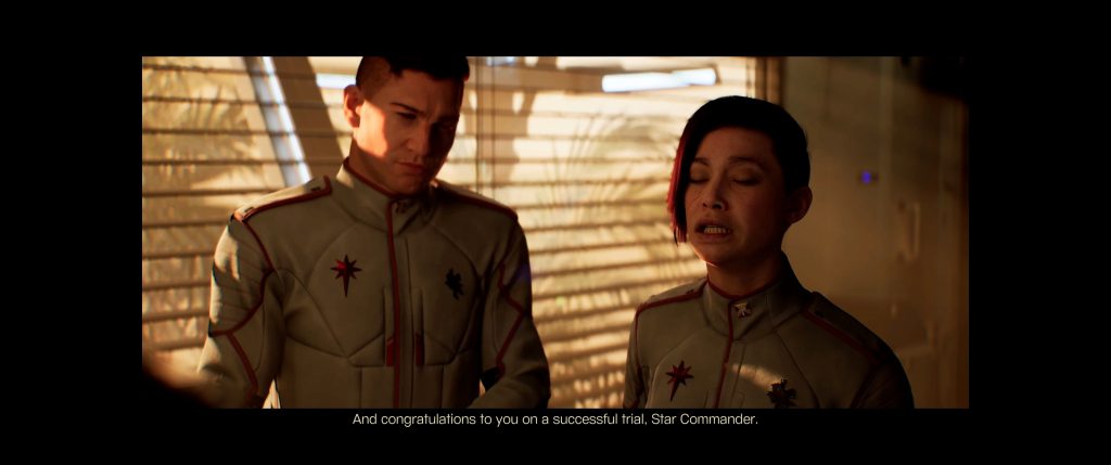 A lot of the story is told through the cutscenes, which you absolutely should not skip. The acting quality is decent - this isn't Baldur's Gate 3, but it's not Mercenaries - there's some stiffness in what they say that can be explained by the clan's weird formalized grammar, and some spots where the audio mixing isn't great and things sound a little off.