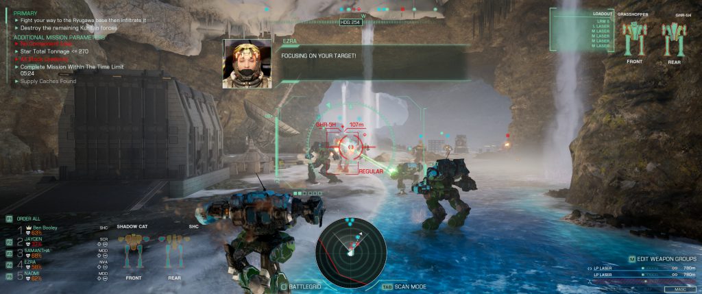 New to Clans is a more in-depth system for controlling your star. By pressing B you can open up the battlegrid, a top-down view of the map where you can select mechs and give them movement orders (by right-clicking the ground), attack orders (by right-clicking a hostile), or tell them to use a repair bay (you guessed it, right-click the repair bay). By hovering over a mech you get the paper doll that shows how much damage they've taken, which is hugely useful over the simple progress bar you had in previous games, and with the more detailed controls you can keep damaged mechs to the back of the fight for protection. The battlegrid controls are mostly useful for setting up fights, rather than moment-to-moment control of an ongoing fight. When you open it your mech will just keep walking straight forward, so it's risky and costs you any damage you'd be doing while you have it open. During a fight the function keys allow you to control your star. which I found most useful by pressing F1 (select all), then F1 again (attack my target) to keep all five mechs shooting the same enemy. Ganging up on a target is the best way to reduce incoming damage, and thus keep your mechs alive.