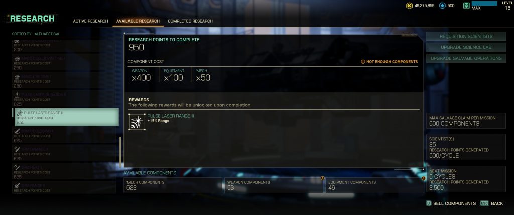 If you're playing on the harder difficulty you will likely want to pick just a handful of weapon systems to stick with. Clans has once again tweaked the between mission flow - you still have a mechbay (with some differences to Mercenaries, which I'll get into in a minute), but you also have a new Research section. As you're Clan pilots fighting inferior Inner Sphere mechs there's no salvage to select from any more, instead you get Mech, Weapon, and Equipment parts that get used by your scientists to research a wide variety of upgrades. There are nowhere near enough salvage parts or research time to get everything. In my playthrough on regular I put a couple points into a wide variety of weapons, often ones that overlapped, but if I was playing on hard I'd likely want to stick to fewer different weapons that I can upgrade further. Either way, make upgrading your salvage operation a priority. You want to get as many parts as you can as quickly as possible.