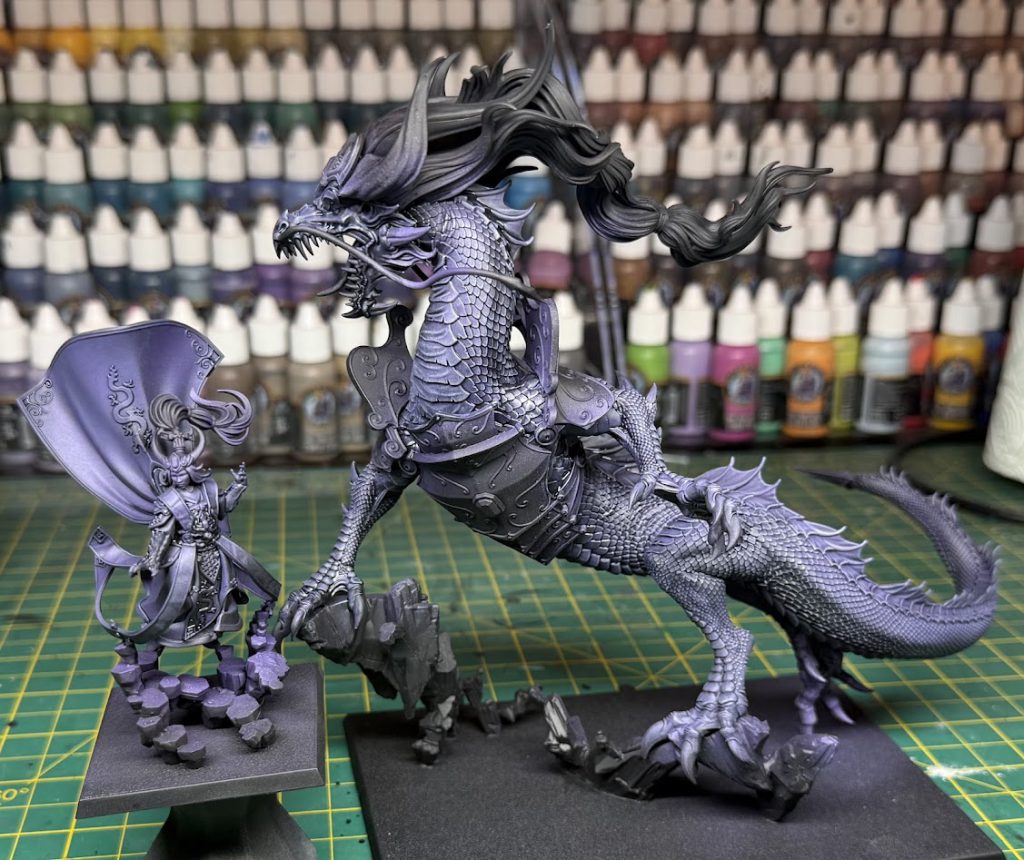 Miao Ying with the purple steps complete. Credit: Rich NutterAfter priming black, I set about with some purples to produce a black to purple gradient on both the dragon’s scales and human Miao Ying’s robes. Purple is definitely the focus colour here, so it’s worth putting in some extra time. On the human form I finished this off with some gentle layering to smooth some transitions, and a couple of edge highlights. On the dragon form I drybrushed all over very gently with a light lilac colour. Once everything was dry I gave it a wash of Black Templar contrast thinned heavily with airbrush thinner (probably at least a 4:1 ratio of thinner:paint). This shades the recesses without tinting too much, and was especially good for adding definition to the dragon.