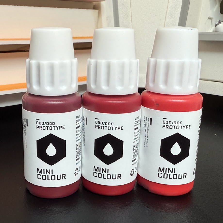 Mini Colour red bottles. Credit: Rich NutterI received three paints from the Red set: Sangria, Cherry, and Cardinal.
