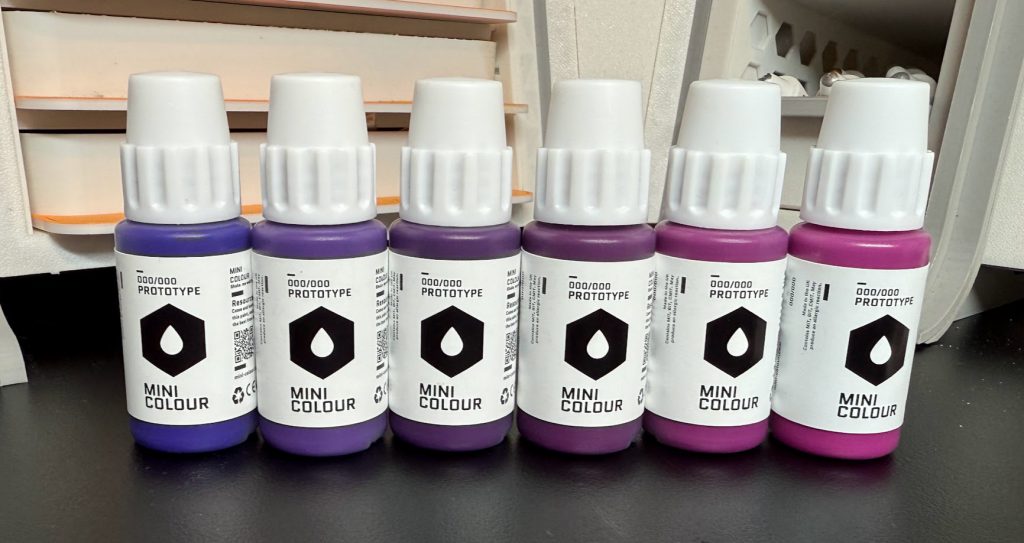 Mini Colour purple bottles. Credit: Rich NutterI managed to get a look at the entire Purple set. Citadel’s Screamer Pink and Barak-Nar Burgundy are two of my favourite paints ever, so I was especially keen to see how I could replicate those using the Mini Colour range.
