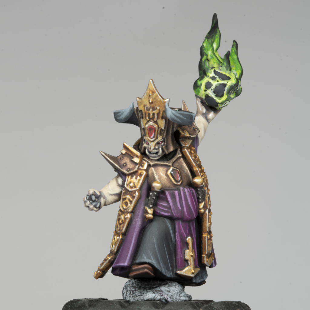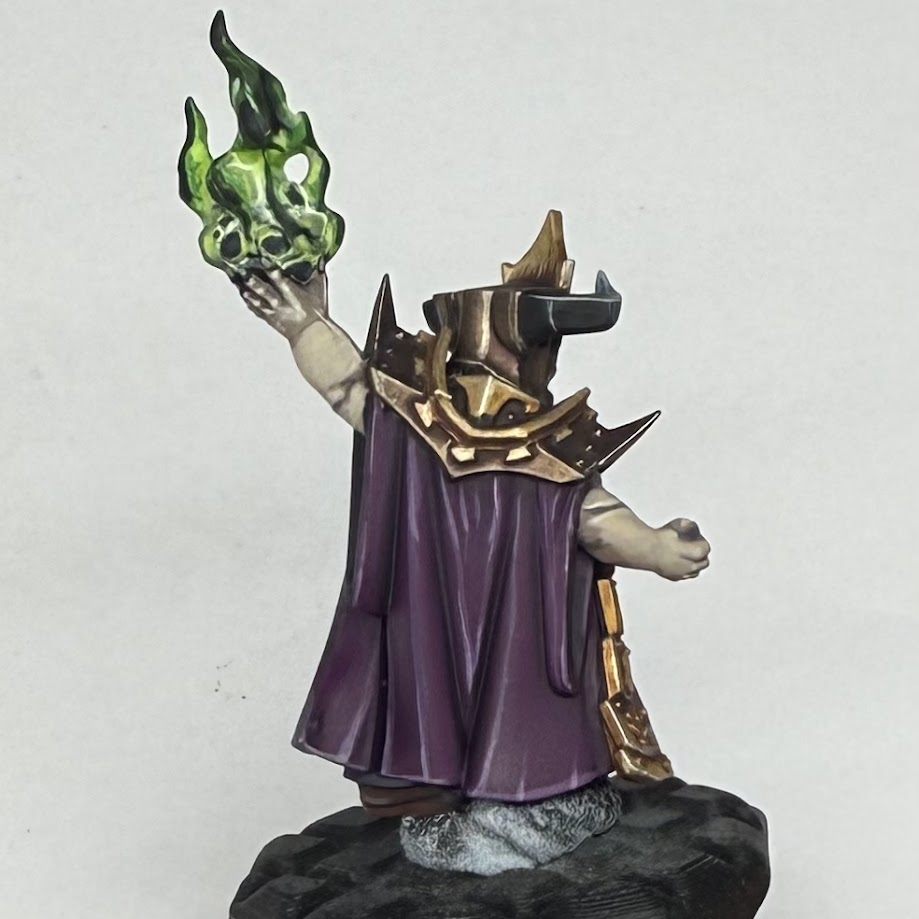 Daemonsmith rear view of robes. Credit: Rich NutterThe robes were basecoated in Damson to get a slightly different colour, although if I was doing it again I'd start with Plum, or maybe a Plum-Damson mix. They got a gentle shade of Damson, before mixing in some black for the deeper shade. I did some gentle glazed layers of Damson mixed with Hollyhock, which don't show up very well in the photo. The highlight is a mix of Damson, Fuchsia and White, to try and differentiate from the sash highlights. I did try some recess shading with Violet and Lavender here, but I found that they turned the tone too blue for the effect I was going for. This can be a good effect for building colour contrast, but it wouldn't have fit in with the rest of my Helsmiths, so I ultimately stuck with Grape and black.