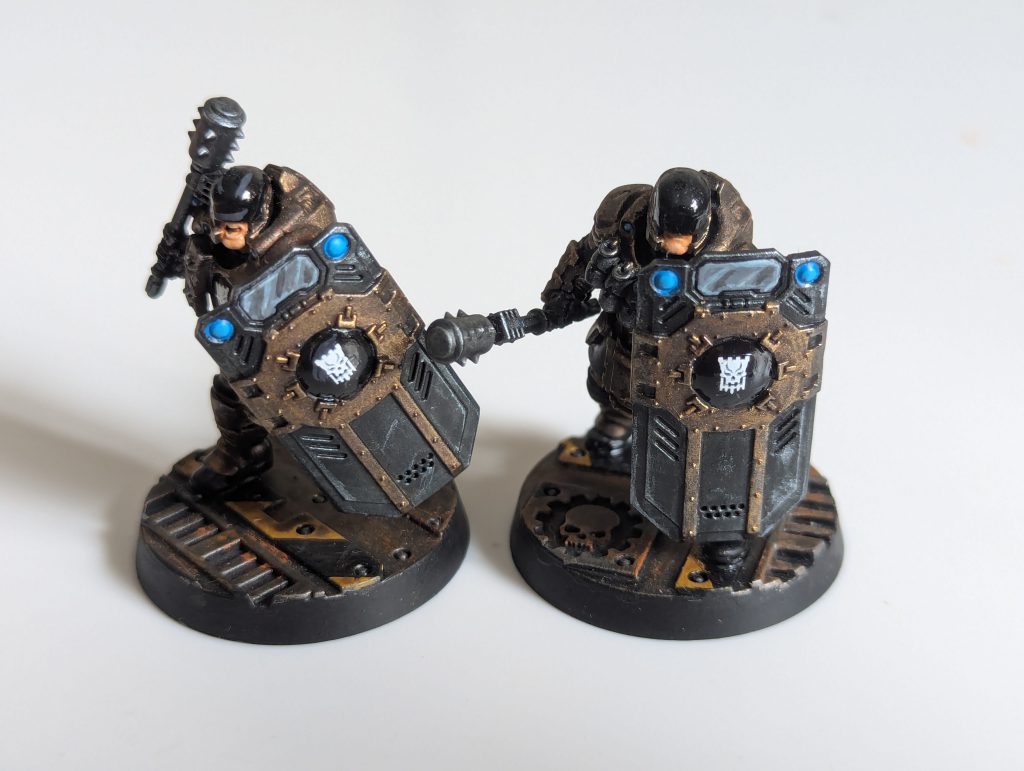 - Riot Shields are a new piece of kit, providing the same protective effects as the classic Subjugators’ Vigilance Assault Shield. It costs slightly less (35 credits rather than 40), but is -1 to hit and lacks the very useful Knockback rule. The important thing is that this is available to Captains, Palanite Sergeants and Palanite Patrolmen. This strengthens Enforcers’ identity as a heavily armoured gang, at least later in campaigns. It’s clearly less effective than, say, an armoured undersuit, since it costs more, the armour bonus is conditional, and it actively hampers most users’ reaction attacks in melee. But the save-stacking potential is very real, especially to resist melee attacks from the front. We are really excited that that visually evocative playstyle, of shielded enforcers advancing while blasting away, is extended beyond Subjugators to the regular Palanites. Expect those shield bits to be in high demand.