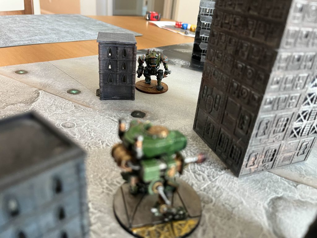 All of the models for this game are 3D printable, with some options to buy physical prints around the internet in either 15mm or 32mm scale. The game is designed around playing the former, 15mm, scale on a table half the size of a Warhammer 40k table or 3’x2’ board with the 32mm scaled version simply doubling all sizes and ranges. Throughout we’ll be referring to everything assuming you’re playing the “normal” 15mm scale. Jake printed off a 32mm mech and while it would be very cool to play big stompy robots at that size it’s just far less reasonable and requires a larger terrain investment; this game wants you to play with a pretty dense table of terrain or to simply play very, very, short games.