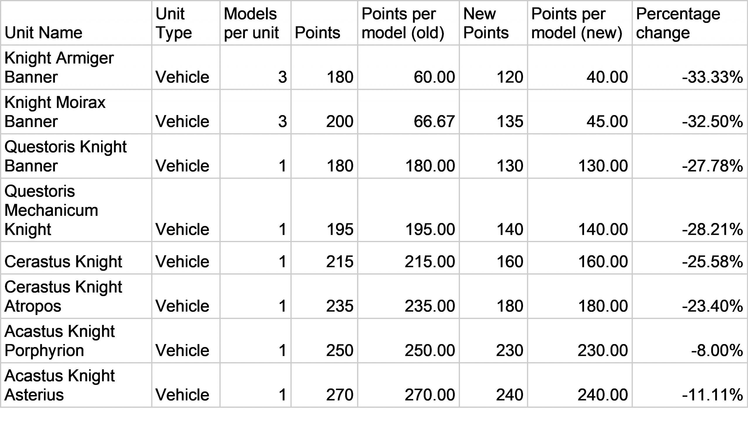As you can see, Armigers dropped by about a third, Questoris about 28%, Cerastus around 25% and Acastus around 10%. Fielding a pure knight force your model count just jumped about 25%.