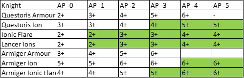 This is something where the Ion Shield rule could do with a rewrite to make it do something, as most of the time it just won't come up, meaning players will forget about it completely. (Knight players, you can print out the above table, laminate it and include it in your play aids for checking if your Ion Shields do anything.)