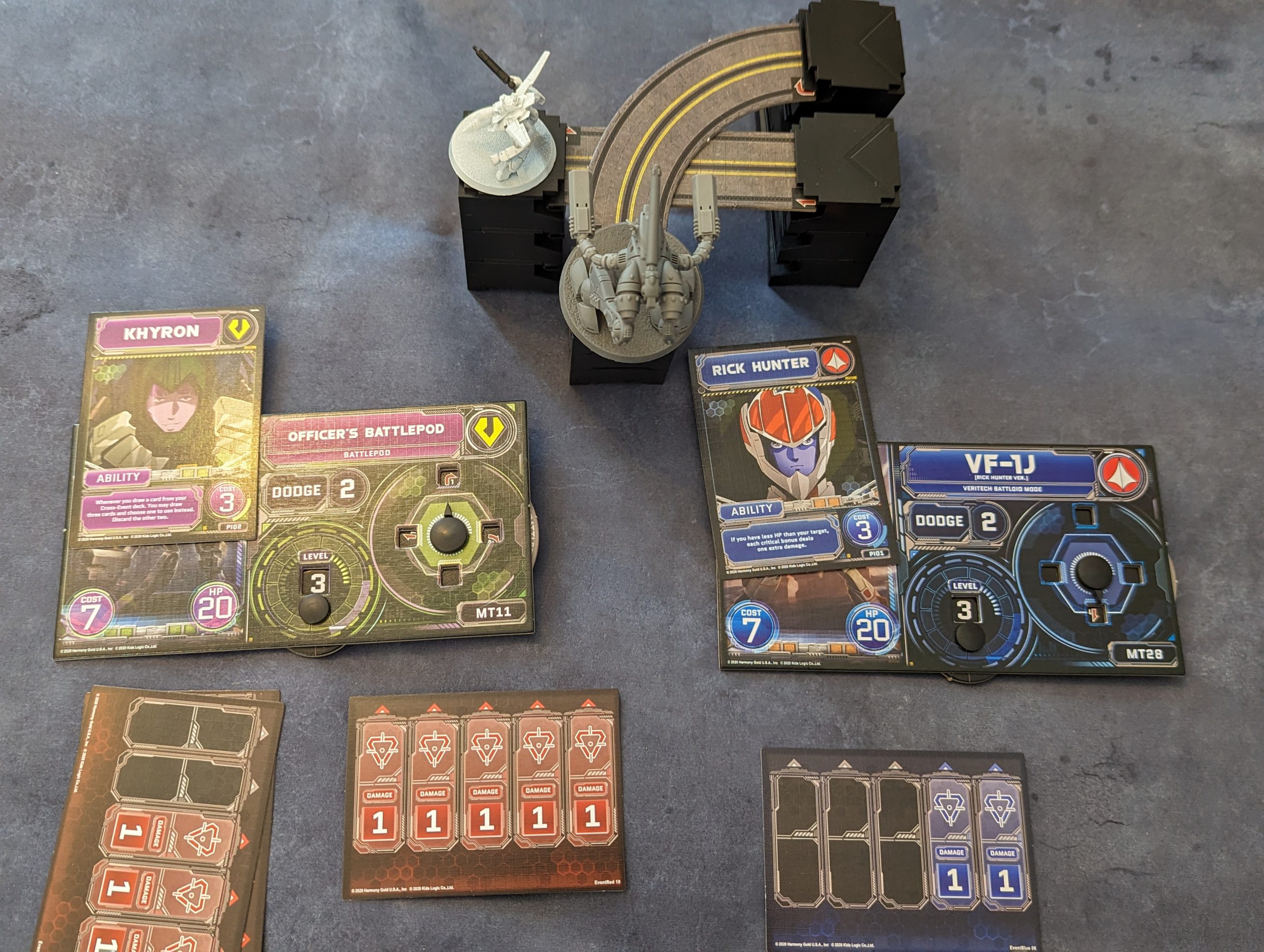 Head-on combat leads to both planes taking two damage cards, but the Valyrie does more damage due to scoring a critical hit.Prior to the release of the Kickstarter, there are only two units that can be used in the game, the Zentradi Officer’s Battlepod and the UNSPACY VF-1J. This limits the playability of the game significantly, especially as there is only one pilot per faction available.