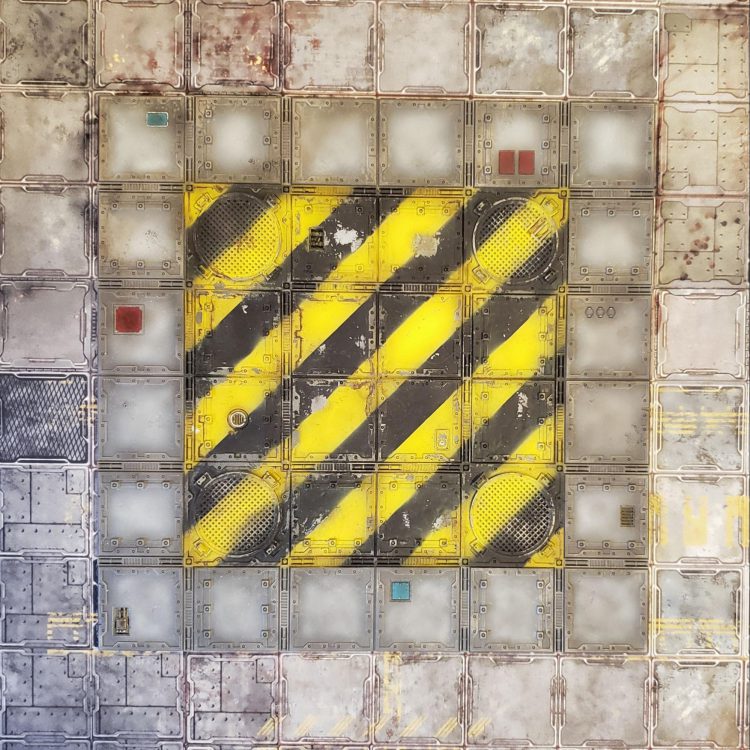 The mat I received was the “Industrial Zone” with a grid of approximately 2” x 2” squares. I say “approximately” because the scale is slightly off; in the image below you can see how it looks compared to a 12” x 12” Games Workshop floor tile; while aligned on the right you can see on the left hand size that the end of the sixth square on the mat isn’t the same as the end of the tile. This might be problematic for an obsessive-compulsive who wants their Zone Mortalis stuff to fit perfectly, but if you just want to create an industrial warzone for Sector Mechanicus Necromunda games it should be fine.
