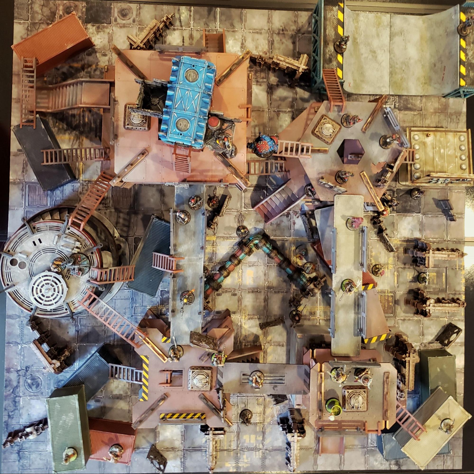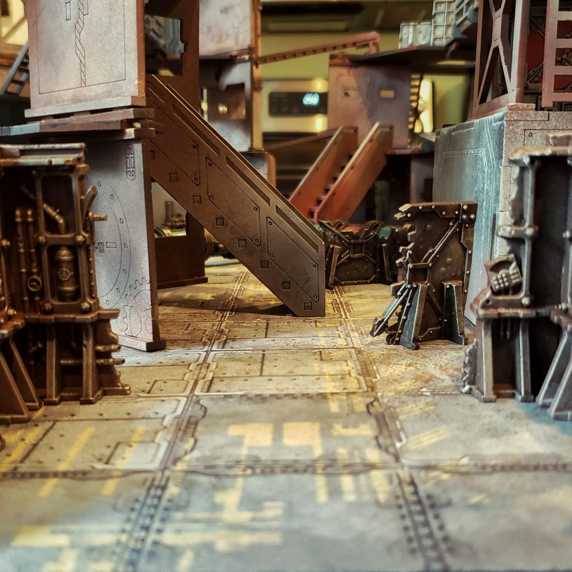 Like taller Kevin, my mat was also delivered in a sturdy cardboard tube. As someone who has played a lot of 3D Necromunda games on a single color textured table topper sheet, I was excited to give this mat a go! The printing and build quality is top notch. It’s sharper and more vibrant than my FLG & F.A.T. mats, and on par with a Mats by Mars vinyl mat - definitely a feat for neoprene. The design is a nice riff on the Zone Mortalis sort of motif - but would also fit right in for a Zona Alfa or Stargrave table.