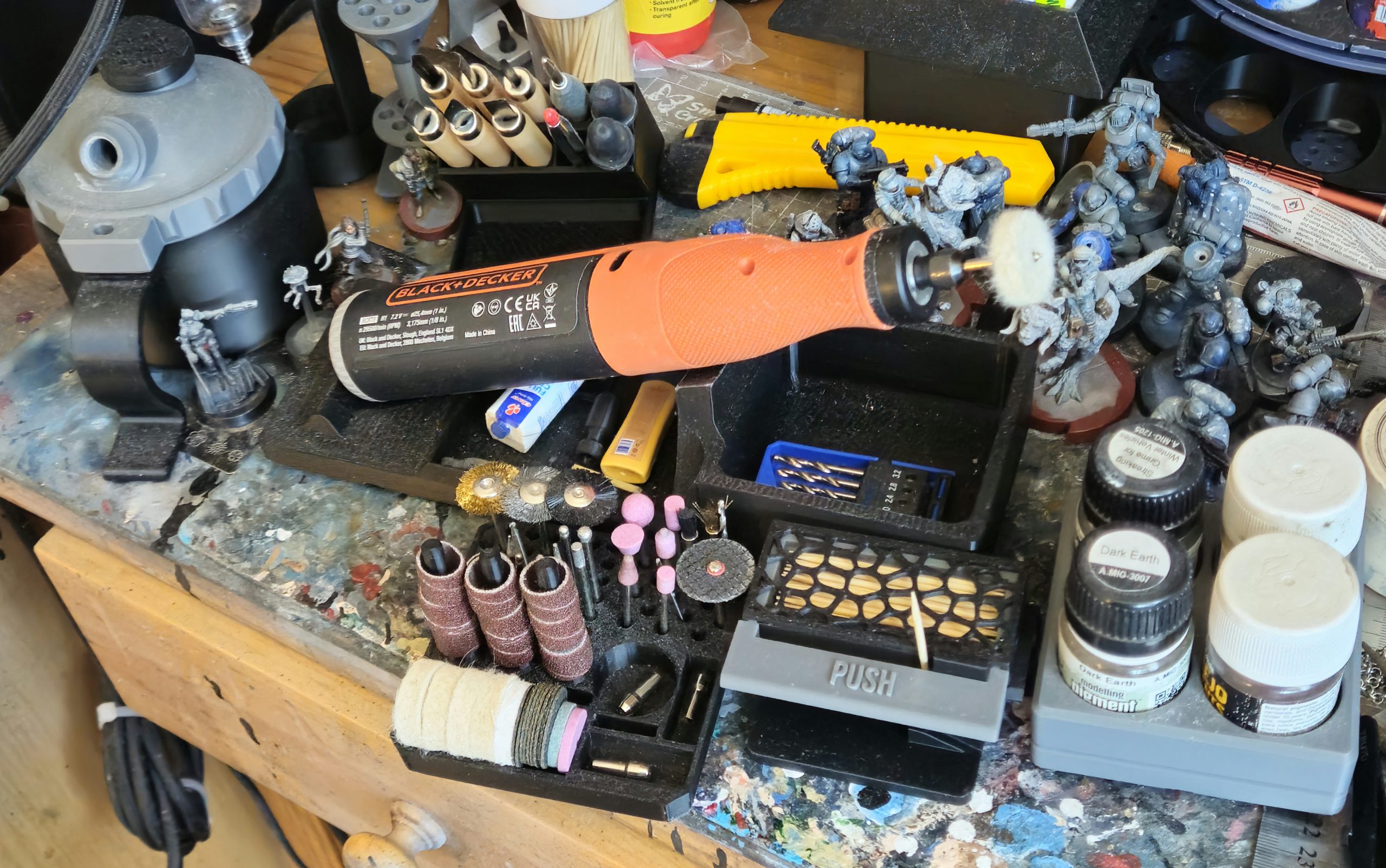 Some of my printed hobby desk items. Left to right: Airbrush cleaning pot, tool organizer; rotary tool stand; rotary tool bit storage tray; toothpick dispenser; pigment holderThere are more paint organizers and brush holders than you could possibly need. When it comes to these objects, I browse for a design, load it in with my filament's preferred settings and let it run. A few hours or one sleep passes, and my desk is a bit more organized. Game aids, too. How about an articulated measuring tool? Clicky customizable counters (with stand)? Themed spell slot tracker for the RPG nerds? Modular dice containers?