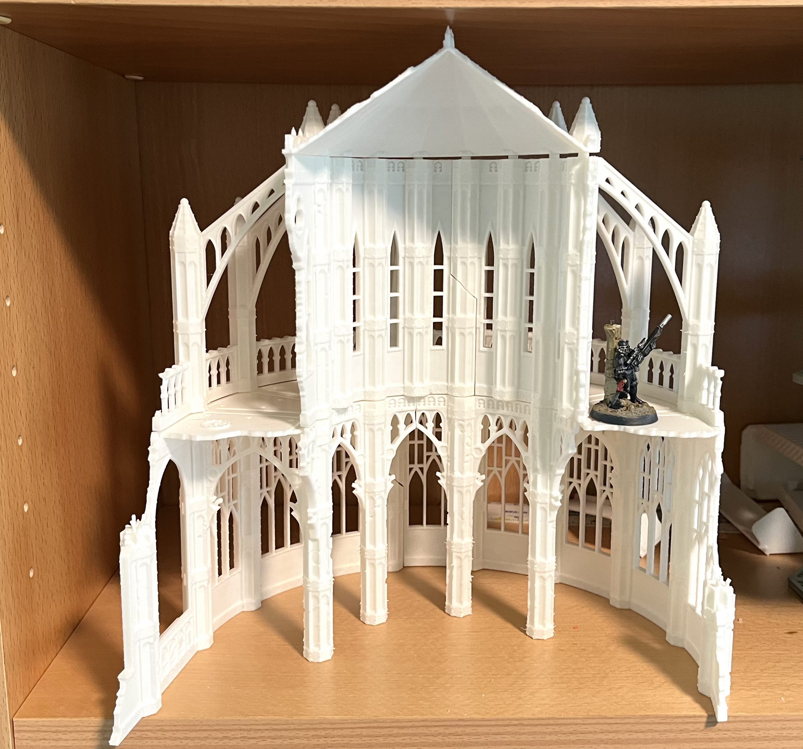Big honking printed cathedral, with assassin for scale. Files from Fabricator’s Lair. Credit: head58Almost all the downsides of store-bought scenery are eliminated with a reliable printer. You can get a deeply personalized scenery collection at the exact scale you need. I'm no longer spending sizable sums on barrels, crates, and ruins when I can print the exact number I need on-demand. And yes, the volume of scenery you can potentially get out of a standard 1kg roll of filament ">is fuckin A. That 1 kg of filament is usually under $22.