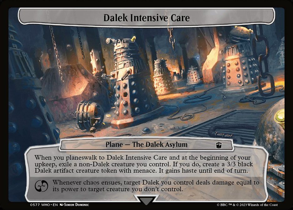 TheChirurgeon: The creator of the Daleks was designed to be a real son of a bitch with strong fascist beliefs. His mobility scooter there is probably the prototype for the tech that would become the Daleks later on. It's appropriate then that this guy builds you an army of Daleks.Loxi: If I played this card I would absolutely say every turn "YOU FACE A VILLAINOUS CHOICE." That aside, this card is pretty cool. It leads to a group slug/burn-y playstyle that has great colors and constantly adds card advantage- let's face it, 90% of players will feel that discarding a card feels worse than giving you one, regardless of how untrue that may be. Honestly a pretty solid commander, but requires a bit of finagling to get support for the Daleks outside of this precon.