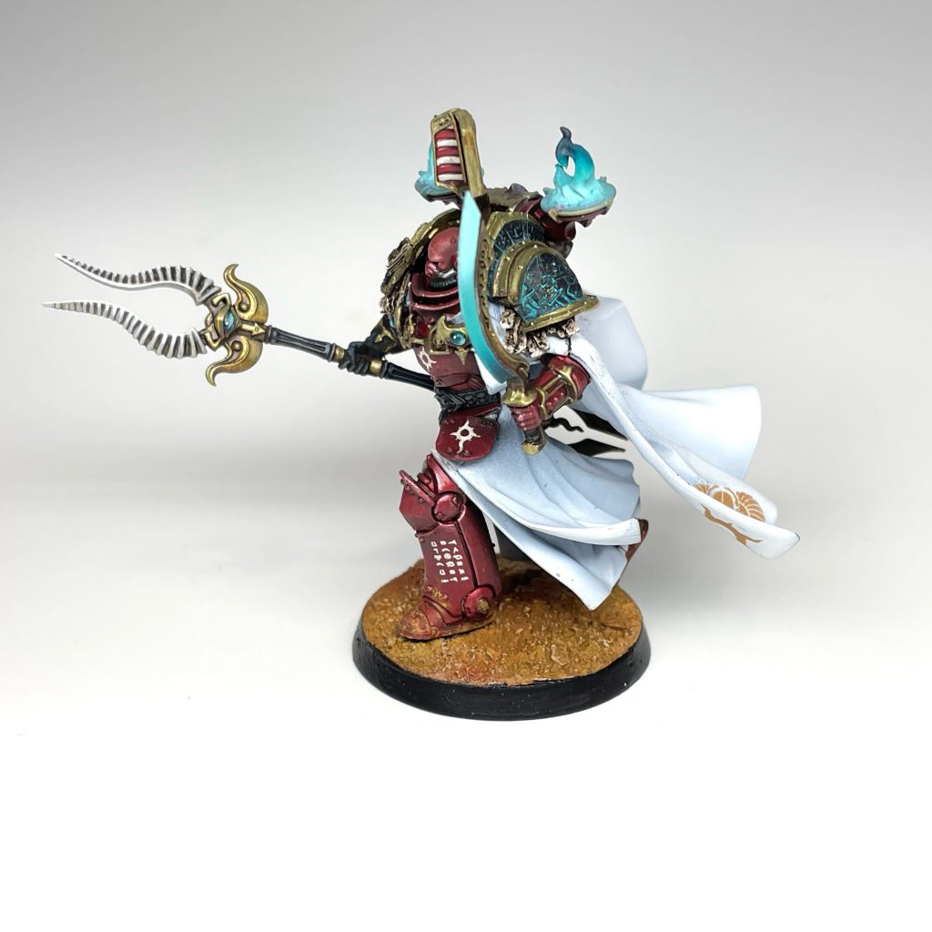 I left the main body of the model and the cloaks largely unchanged. I removed the sculpted Dark Angels iconography from the armor and set about replacing the arms, shoulder pads, backpack, and head. The Thousand Sons Exalted Sorcerers box is an incredible source of bits for 40k and Horus Heresy Thousand Sons. The backpack, headdress, left hand/weapon and the bottom of the staff are all from the Exalted Sorcerers kit. The right hand and staff are a trimmed down Black Staff from 40k Ahriman, and the head is from Primaris Aggressors/Eradicators. The shoulder pads are from Lorgar's Primarch model, and I thought they looked perfectly studious/occultish for this application. They also were large enough to cover the most problematic area to deal with, his right shoulder/cape.