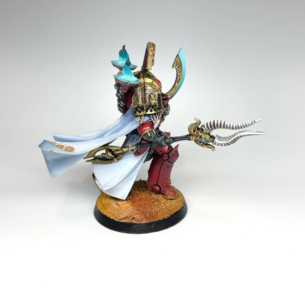 Washes help fill things out a bit, the gold gets hit with snakebite leather, the cloak coelia, and the rest of the robes thinned agrax. As for details, the red is druchii, scrolls sepia and then the steel is washed down with turbo strength nuln aka basilicanum. A detail spotter might notice the wax of the seals is shyish purple over the scroll base coat.