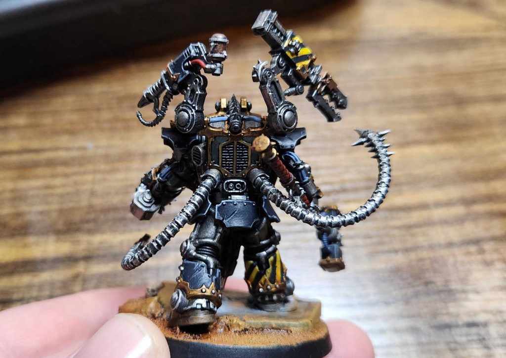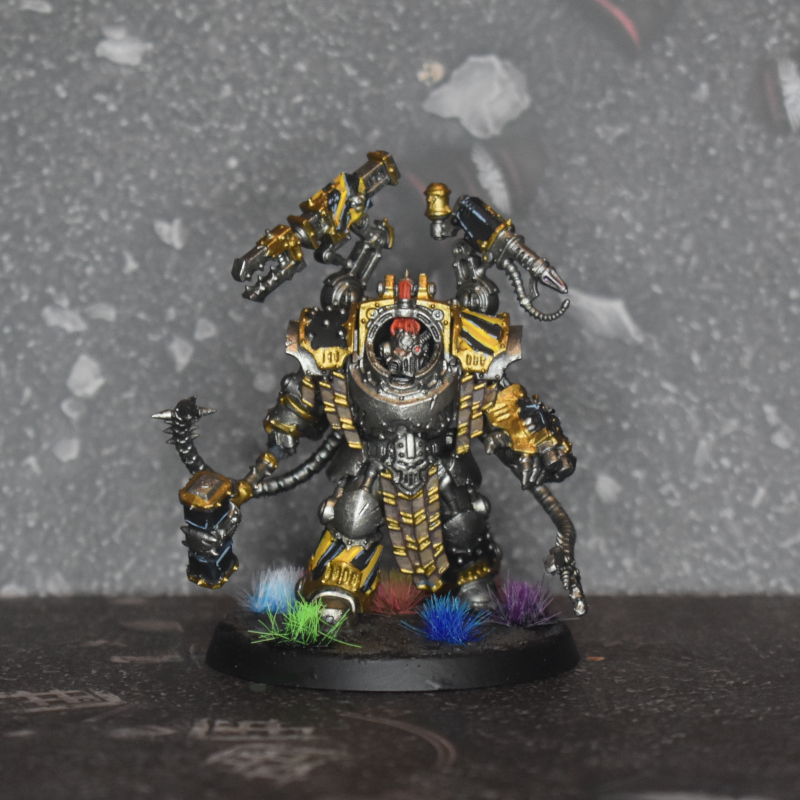 Kravek Morne. Credit: CorrodeThis model was pretty straightforward to assemble and paint. He doesn't come with the full hero rock you see up there - I added that myself, along with some skulls from my skulls box. The only parts that are concerning are the mechatendrils, and the one behind the hammer arm has an extra contact point to attach to, making it a bit more stable than it looks.