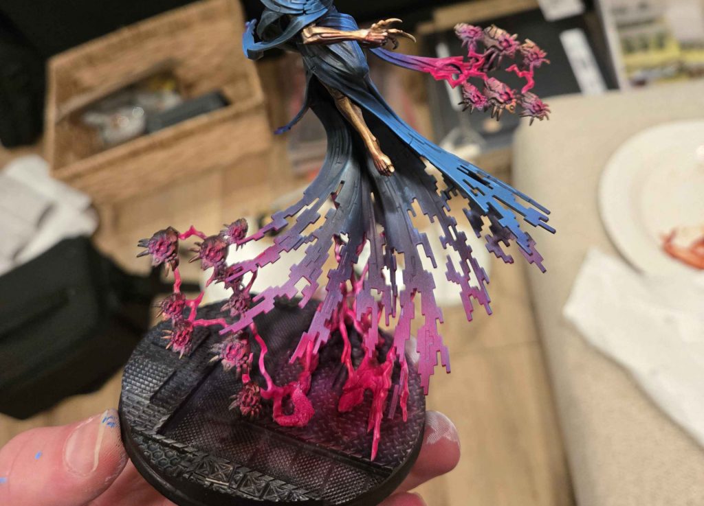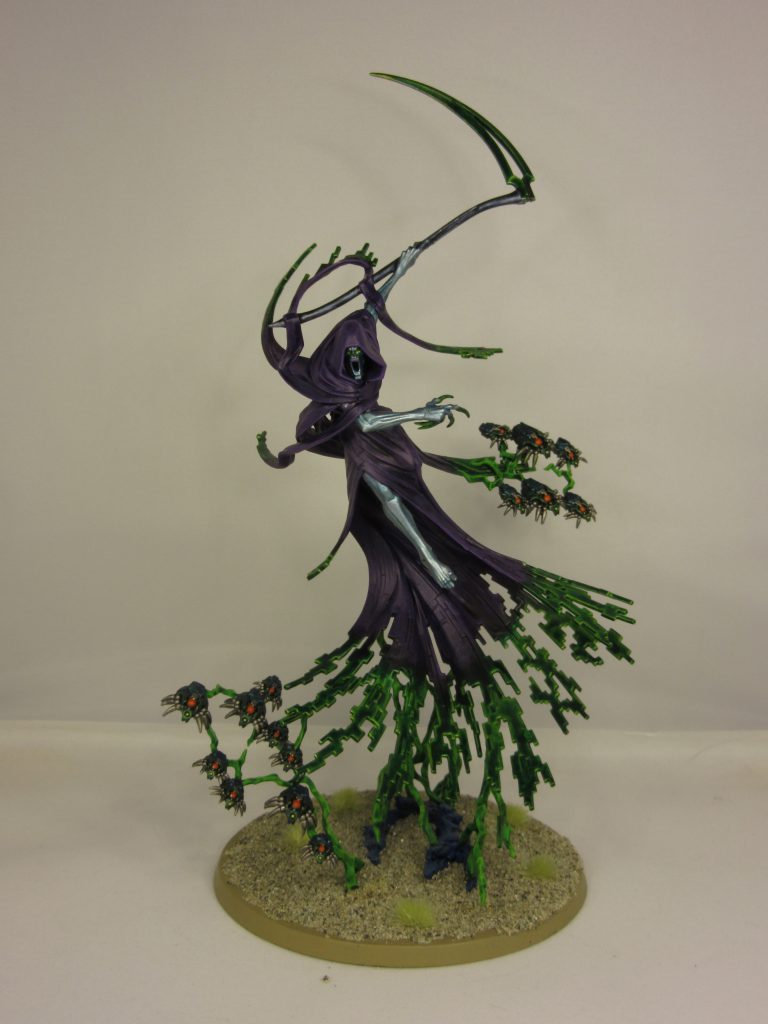 Paint-wise, I wanted to try doing something like the fade effect between the robes and the glowing necron-ness that the box art had, and used a contrast wet blend to do this. My process was to spray the whole model Leadbelcher, then fill in the purple down as far as I wanted it to go with a normal Naggaroth > Druchii violet recipe.