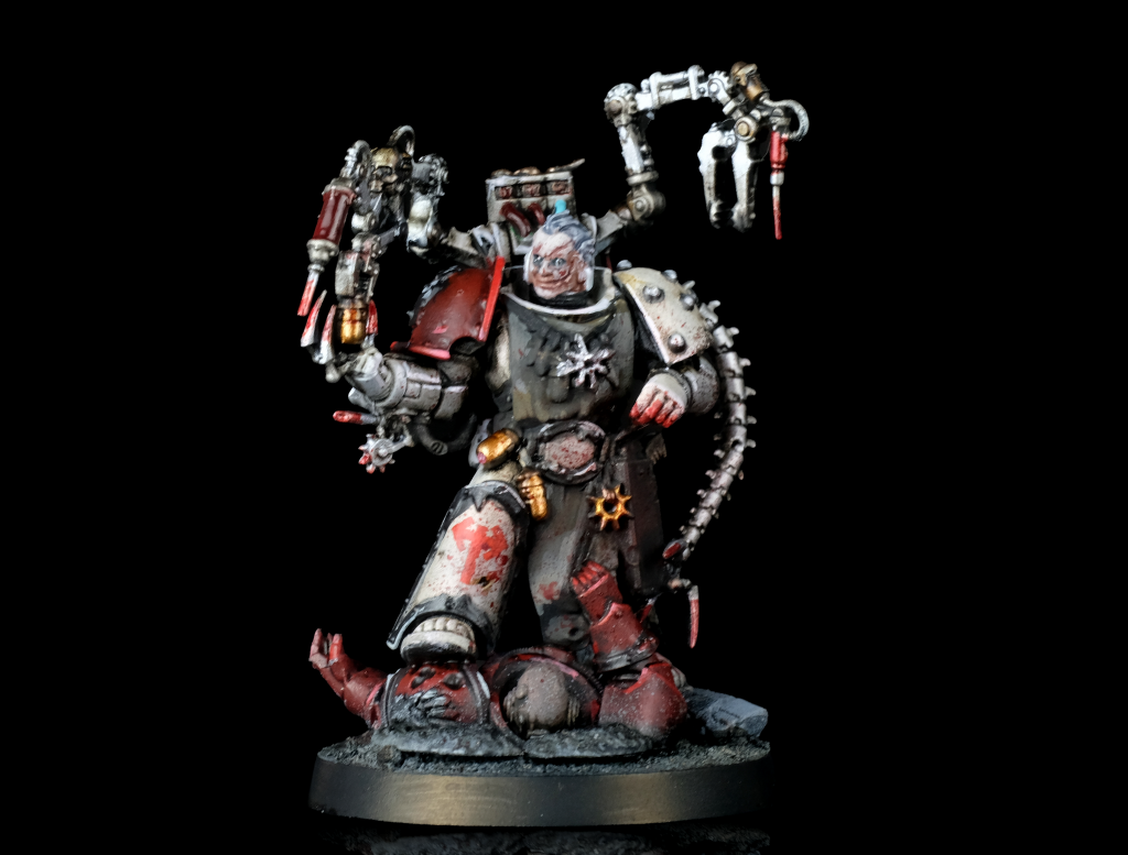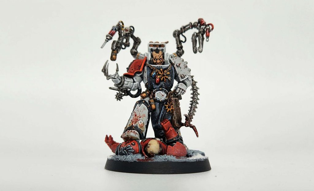 Credit: KeewaKeewa: The next band member is the very creepy Garreon the Corpsemaster, an Apothecary-type who doesn’t seem all that interested in doing healing or any of that altruistic stuff, with his evil mad-scientist face and his various needles and probes, including the kind of syringe that would make a horse run and hide, and a big Doctor Octopus style arm with blades and big poker. This guy is fun - he’s very over-the-top in a kind of Fabius Bile way, and the base is a little diorama standing over a Red Corsair who got completely legless, the fallen gentleman reaching up to grab the leather apron while the big space marine boot holds his other arm down.