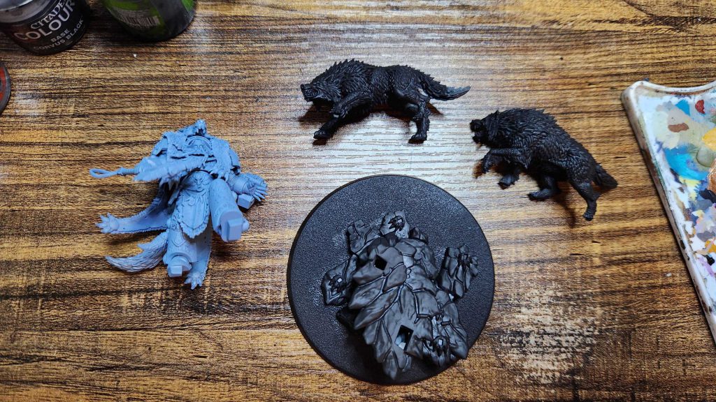 Logan Grimnar. Credit: Rich NutterCronch: What a model. I adore Logan’s new incarnation, he’s truly huge. As somebody said to me when he was revealed, he looks like the design studio got 90% of the way to designing a new Leman Russ then decided to make him Logan instead. He’s got his definitely fine and not chaotic axe, some wolves that are no longer obliged to pull a sled, and another of the same wolves draped across his shoulders. The detail is superb across the model, and I’m really looking forward to what some competition painters do with him. I opted to paint him in subassemblies, tacking the square plug on his foot to a separate base, and painting each wolf separately too. The wolves each have a bit of rock attached, and one thing I noticed was that these parts were quite a tight fit into the main base rock. Once everything was primed and painted, I had to spend a bit of time shaving off layers in some key spots to make them fit again. You may be better off priming the whole base in one piece, including wolves, then separating the pieces afterwards.