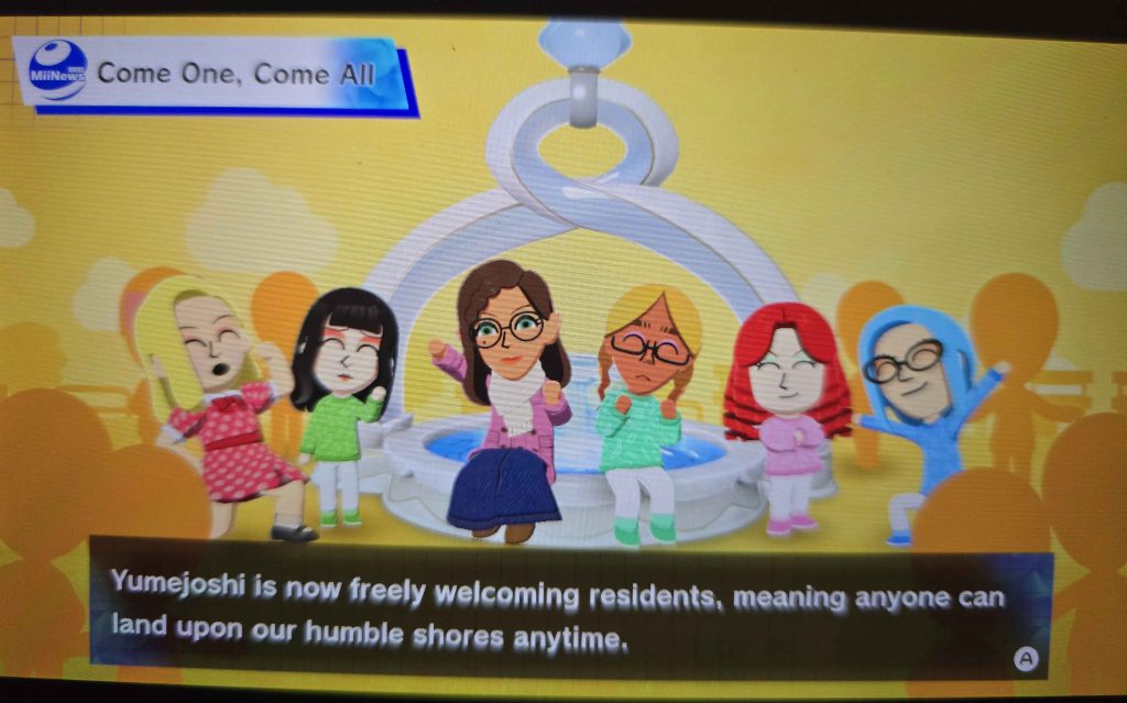 You're going to spend a lot of time not just adjusting your Miis individual looks, but also their sizes in comparison to all of your other inhabitants. Why is this a picture from my phone, you might ask? Keep reading.Tomodachi Life: Living the Dream is the latest in the Tomodachi Life series, which spans Tomodachi Collection (published in Japan in 2009 for the Nintendo DS but never published abroad), and the internationally released Tomodachi Life in 2013 for 3DS (which did release in the states), making Tomodachi Life: Living the Dream a somewhat unlikely successor with a 13 year gap between titles. The concept of the games hasn’t changed much, though: players take on the role of an overseer of Miis, the avatars that became famous on the Wii, and help them navigate social situations in their daily lives. The game is somewhat similar to Animal Crossing in that the player is tasked with managing Miis needs, social interactions, and designing things like clothing or interior design. It is slightly different from Animal Crossing, though, because the player Avatar is never directly controlled on screen by the player (so, no Villager based on ‘you’), and Tomodachi Life has far less focus on the construction and town management that is key to Animal Crossing.