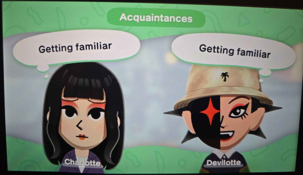 My first island romance once I fixed the dating settings, and so far my absolute favorite. Adelaide the Maid and Xiaoyu are too adorable.Because I can set most of the parameters of my island, my Miis are all women or non-binary, and are all only interested in dating women/non-binary people, creating the perfect Yuri Utopia. But beyond that, the romances between Miis isn’t even really what I enjoy. It is mostly just watching them have goofy conversations, talking about things, spreading island Lingo, or developing their own little webs of interactive social threads. My friends have spent most of their time creating their favorite fictional characters and shipping them together, while I’ve also seen people posting absolute creatures (like the talking buttholes) or memes, helping with the feeling that Tomodachi Life is exactly what you want it to be, rather than giving everyone the same interactions and outcomes.
