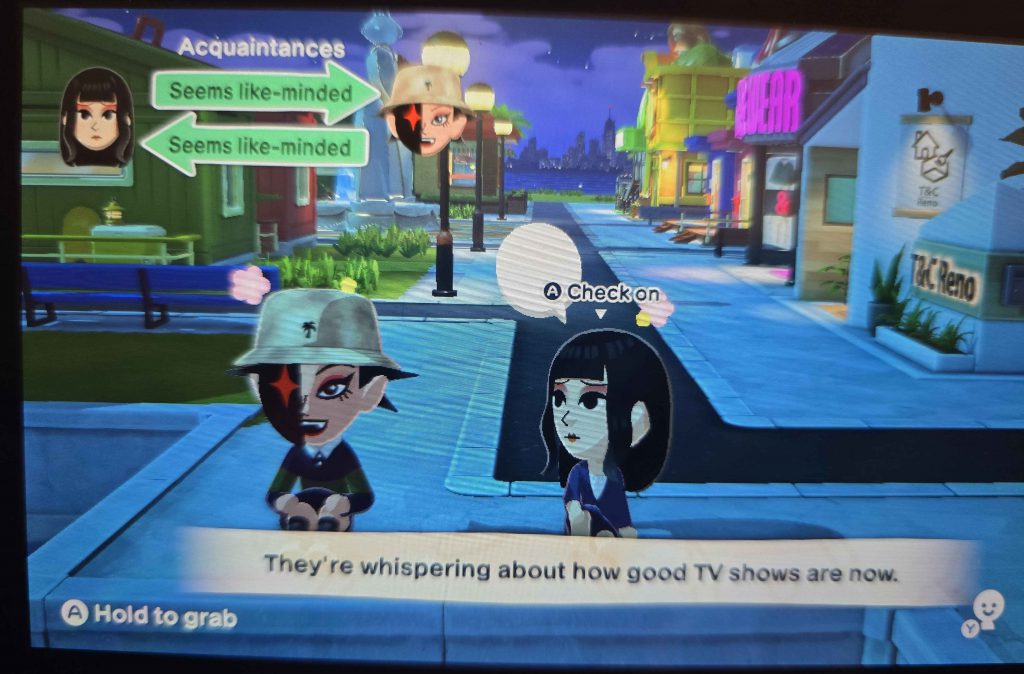 Who doesn't love seeing the island Office Lady chat about how good television is with the resident Chuuni weirdo wearing half a mask and a hideous hat (she won't take it off).Tomodachi Life is a game that should not, realistically, be the game that I am consistently thinking about. I primarily spend my time playing competitive shooters like Deadlock, Marathon, Hunt, or action games like Monster Hunter or a three hundredth playthrough of Dark Souls 2. When I’m not playing those, I primarily play mobile games, and lately my mobile game library has grown while my “premium” or “AAA” game library has shrunk, because I find those games returning less and less return on investment for what tend to be expensive but short experiences that sometimes aren’t even that enjoyable. But I often tend to respect but not invest heavily into “lifesim” games, so putting into words exactly why Tomodachi Life has me so invested may come across as lame: I just find it fun to watch my Miis have a good time.