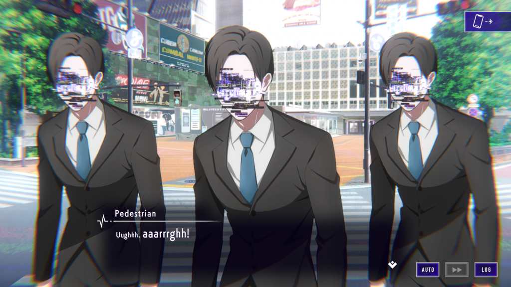 Classic Shibuya Crossing, right?The game is also quite nice to look at, even with the simple 2D sprites of characters and the rendered backgrounds; the backgrounds themselves all have a nice style to them that helps them seem just slightly weirder than reality, and they also have visual touches that make it easier to spot interactable items and points of interest by drawing your eye to them; there is also a feature that helpfully highlights any remaining things you haven’t interacted with yet in the room. The characters are all colorful and visually distinct, and I appreciated the way the developers found to work in occasional 2D animation into the otherwise static sprites and dialogue boxes. This carries over to the puzzles, too, which all have distinct looks and themes to them, rather than feeling like you’re just solving math homework.
